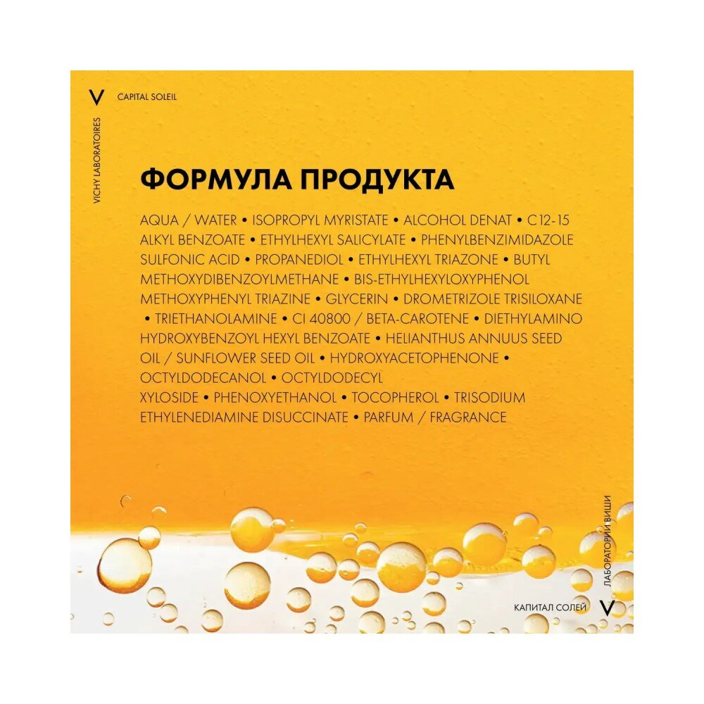 | Состав | aqua / water - homosalate - dicaprylyl ether - diisopropyl sebacate - octocrylene - ethylhexyl triazone - dicaprylyl carbonate - ethylhexyl salicylate - alcohol denat - butyl methoxydibenzoylmethane – glycerin - phenylbenzimidazole sulfonic acid - propanediol - triethanolamine - bis-ethylhexyloxyphenol methoxyphenyl triazine - caprylyl glycol – ci 40800 / beta-carotene - helianthus annuus seed oil / sunflower seed oil - phenoxyethanol - poly c10-30 alkyl acrylate - terephthalylidene dicamphor sulfonic acid - tocopherol - trisodium ethylenediamine disuccinate - parfum / fragrance |