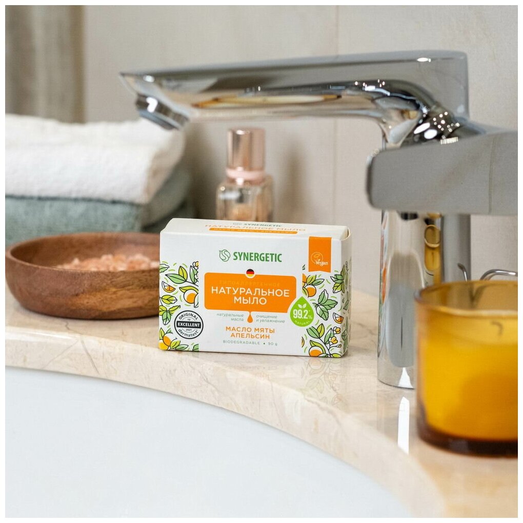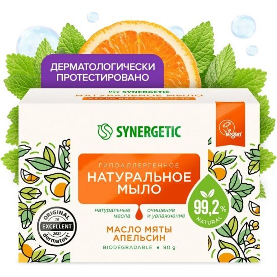 Купить Гипоаллергенное натуральное туалетное мыло Synergetic масло мяты и апельсин, 90 г