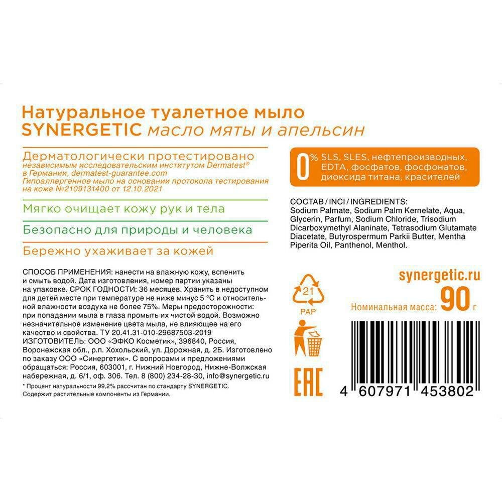 SYNERGETIC Натуральное туалетное мыло масло мяты и апельсин кусок 90гр