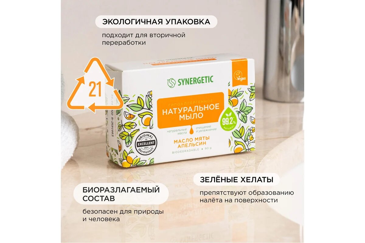 Гипоаллергенное натуральное туалетное мыло Synergetic масло мяты и апельсин, 90 г