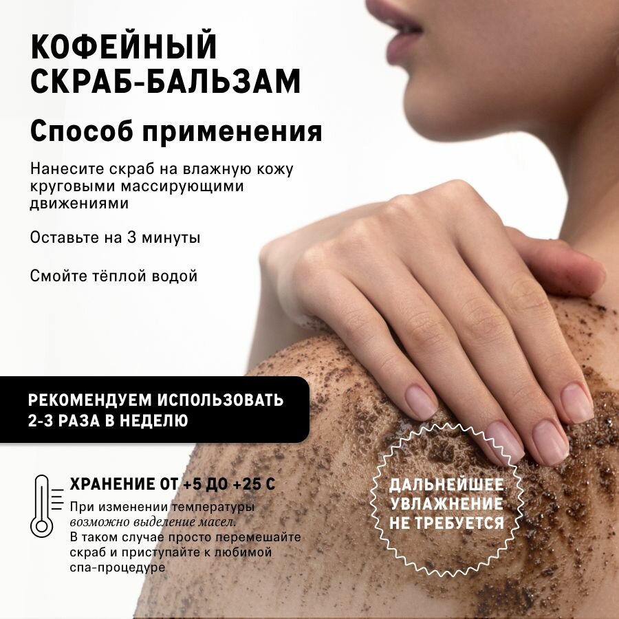 | Способ применения | Нанесите скраб на влажную кожу рук, ног и тела круговыми массирующими движениями. Включите воду в душе и продолжайте втирать скраб, пока он полностью не смоется. Если вы предпочитаете принимать ванну, нанесите скраб и оставьте на три минуты до того, как вы сядете в воду. Рекомендуем использовать 2-3 раза в неделю для эффективного результата. Храните закрытым при температуре от +5 до 25С. |