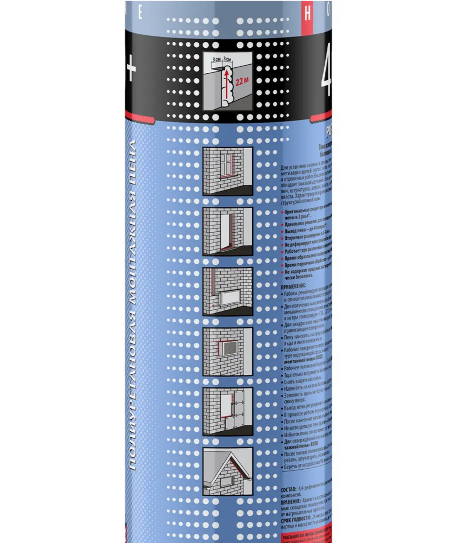 | Дополнительная информация | состав: 4,4-дифенилметандиизоцианат, диметиловый эфир, пропан-бутан, полиольный компонент |