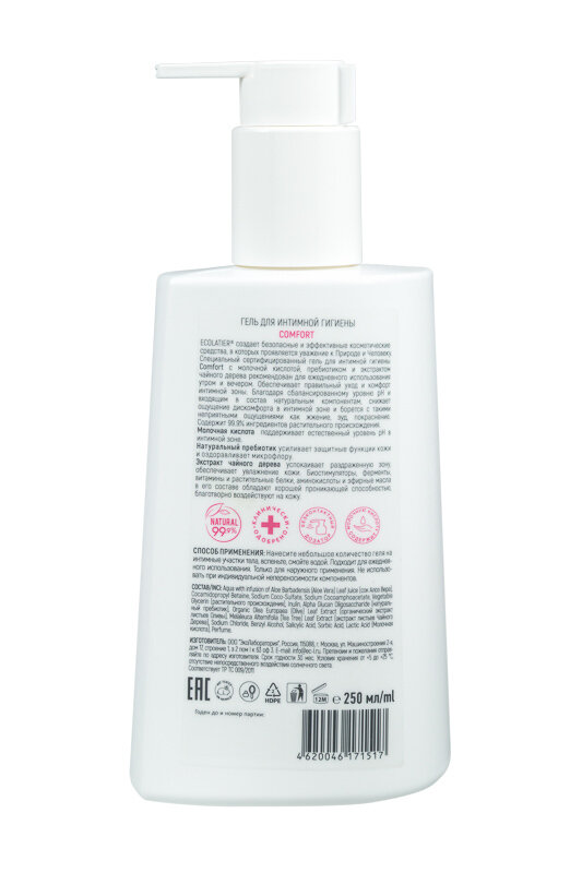 Гель для интимной гигиены Comfort с молочной кислотой и пробиотиком, 250 мл, Ecolatier