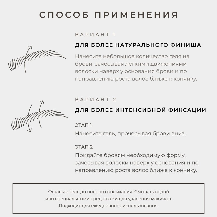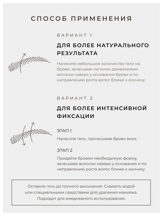 | Способ применения | нанесите небольшое количество геля на брови, придавая необходимую форму. Оставьте до полного высыхания. Смывать водой или специальными средствами для удаления макияжа. Подходит для ежедневного использования. Избегайте попадания в глаза. При попадании - тщательно промойте водой. В случае появления аллергических реакций прекратите применение |