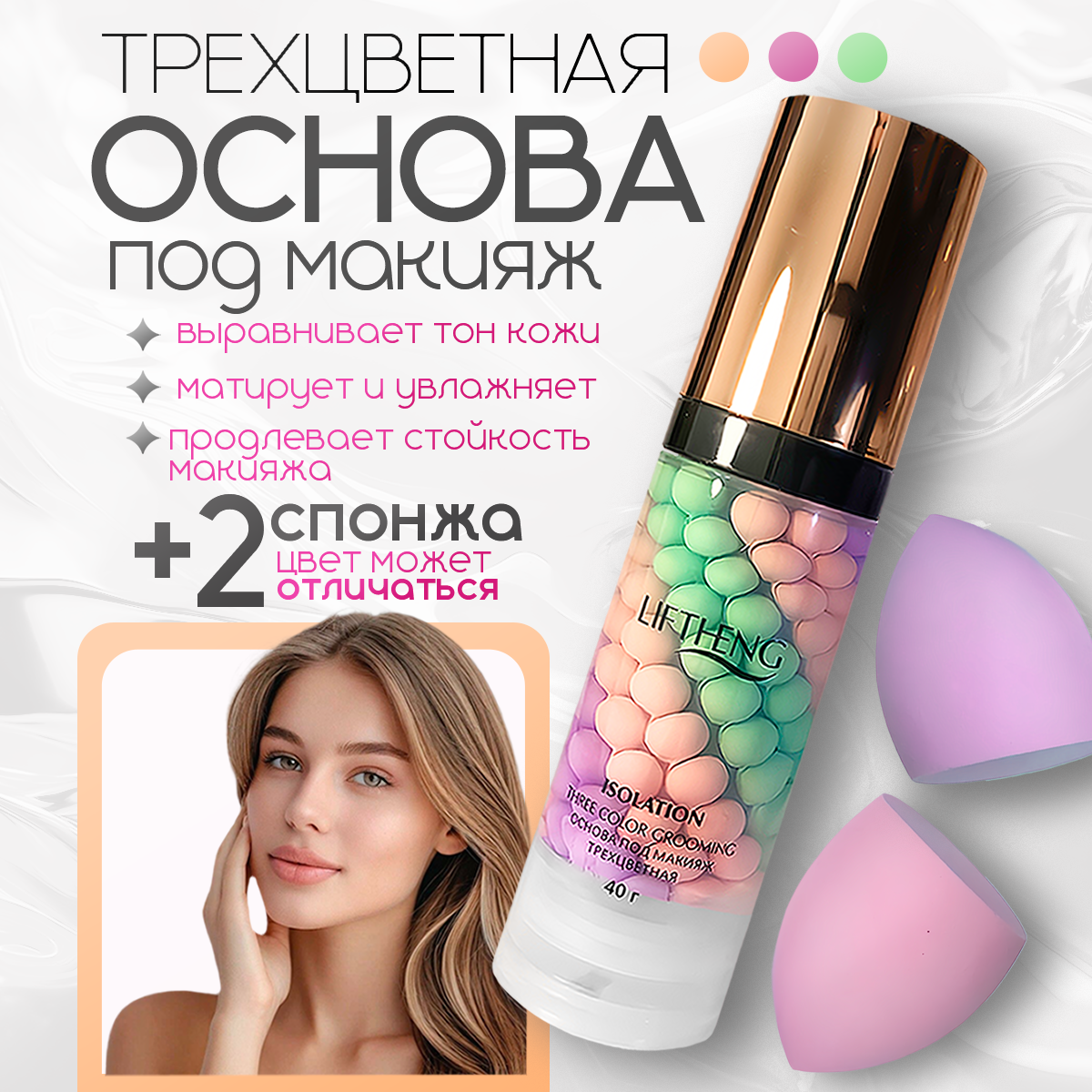 LIFTHENG Трехцветная выравнивающая основа под макияж Isolation Three Color Grooming, 40 г, 2шт розовый/зеленый/фиолетовый