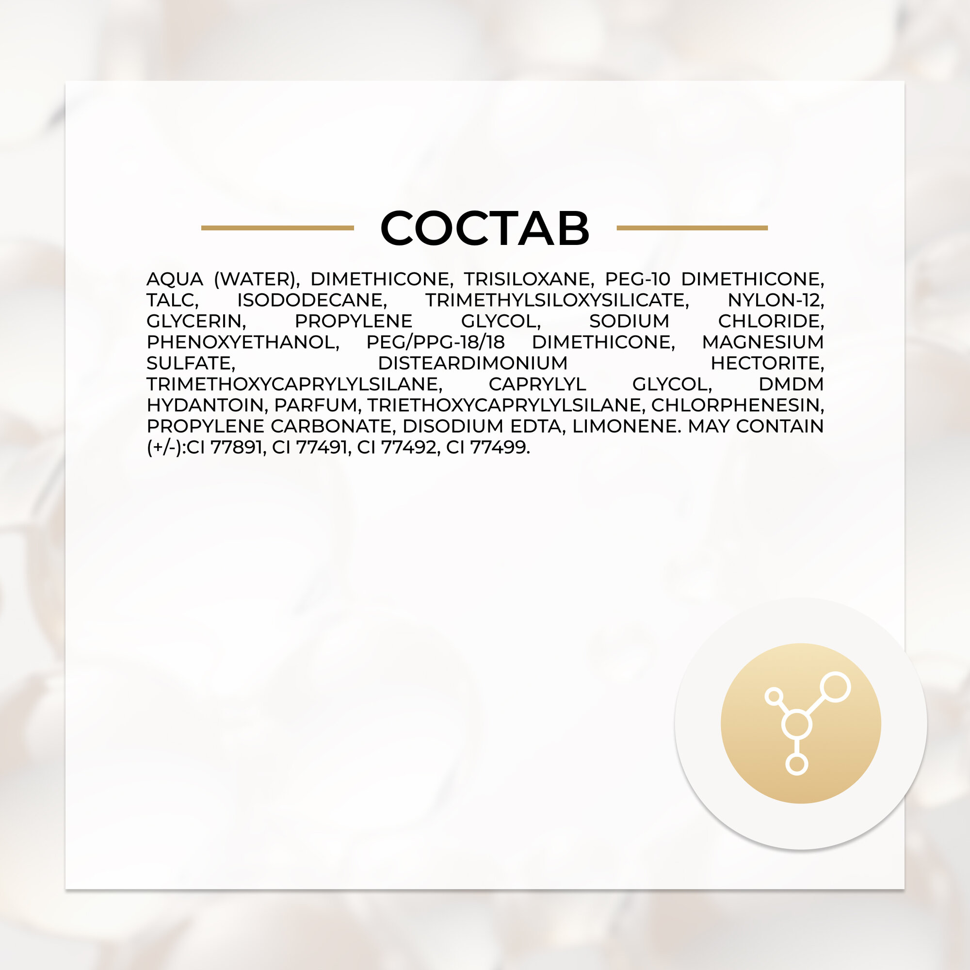 | Состав | aqua (water), dimethicone, peg-10 dimethicone, talc, isododecane, trimethylsiloxysilicate, nylon-12, glycerin, propyleneglycol, sodiumchloride, phenoxyethanol, peg/ppg-18/18 dimethicone, trimethoxycaprylylsilane, magnesiumsulfate, parfum, disteardimoniumhectorite, caprylylglycol, dmdmhydantoin, chlorphenesin, propylenecarbonate, edta. may contain (±): ci 77891 (titanium dioxide), ci 77491, ci 77492, ci77499 |