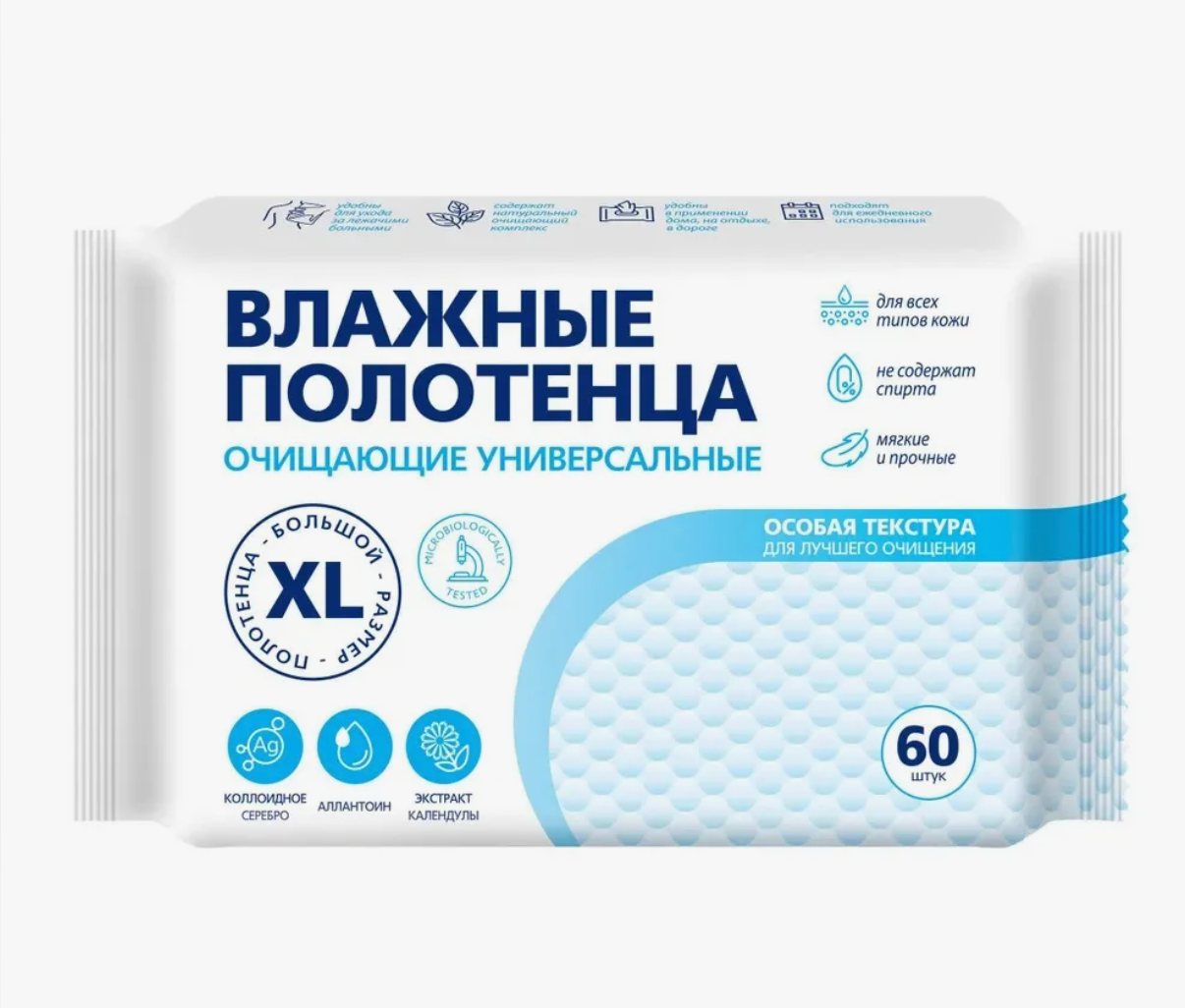Влажные салфетки ( полотенца) очищающие,большой размер XL (2 упаковки по 60 шт.)