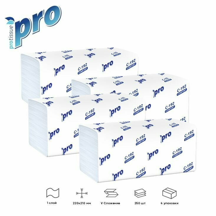 Полотенца бумажные листовые PROtissue С192 V, 1 сл., 250 л., 1 пачка, Comfort