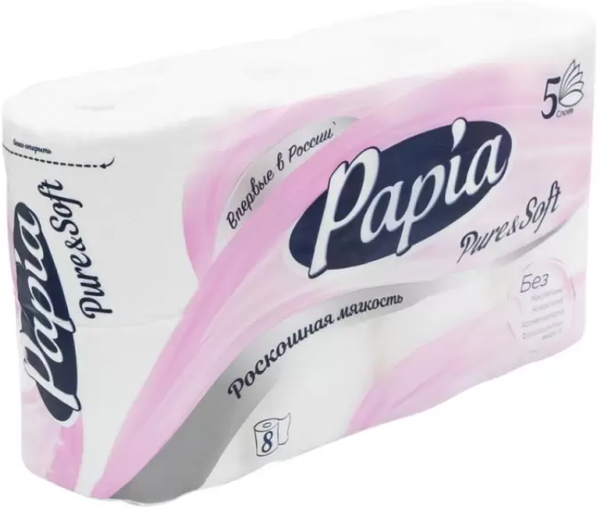 Туалетная бумага PAPIA Pure&Soft - белая, пятислойная, 8 рулонов