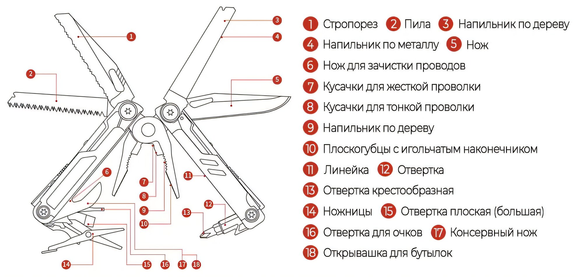 | Инструменты (функции) | консервный нож / кусачки / напильник / нож / ножницы / острогубцы / отвертка / открывалка для бутылок / пассатижи / пила / пилка для ногтей / плоскогубцы |