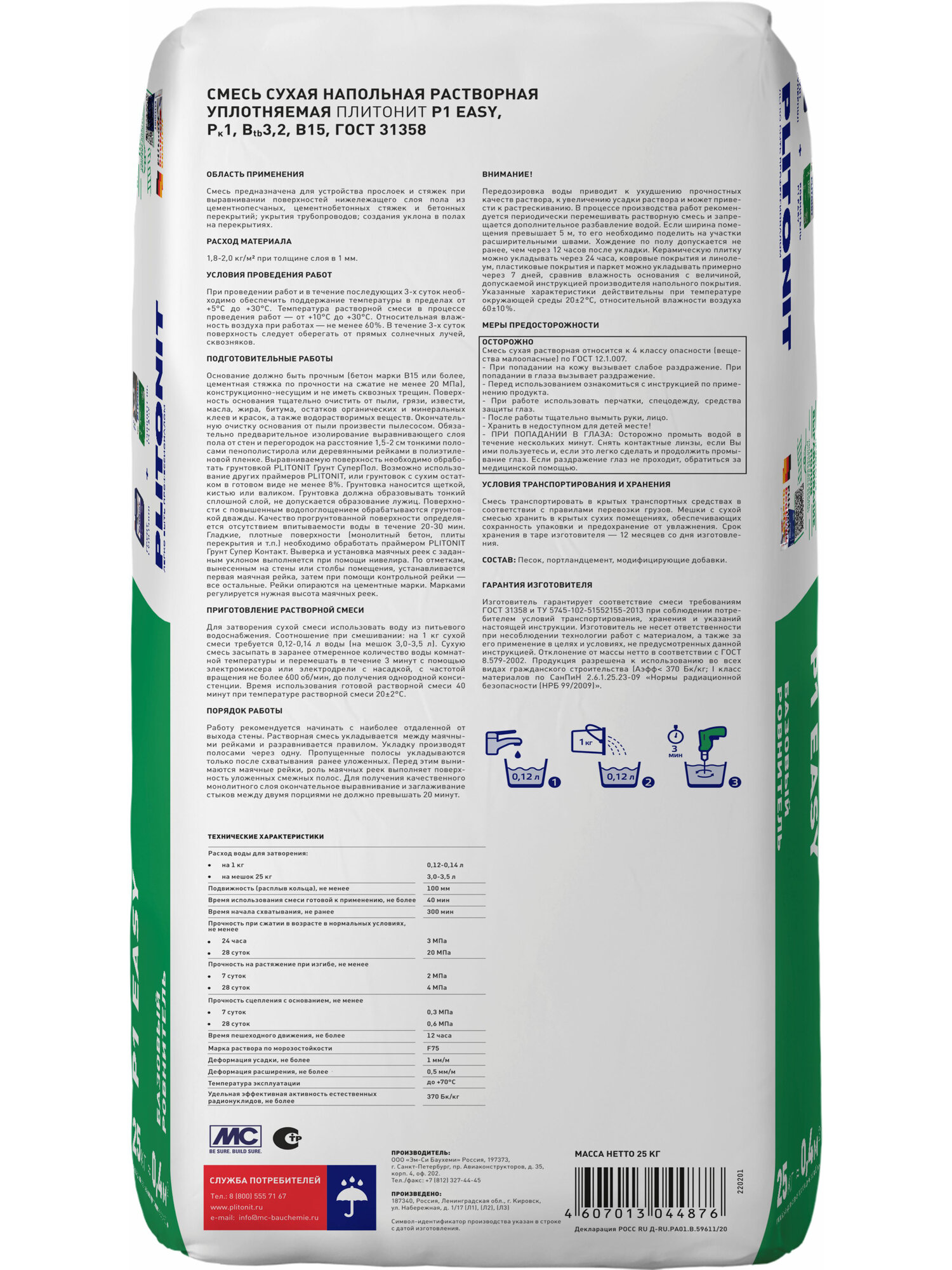 | Дополнительная информация | время высыхания в зависимости от толщины слоя и вида напольного покрытия составляет от 1 до 7 суток |