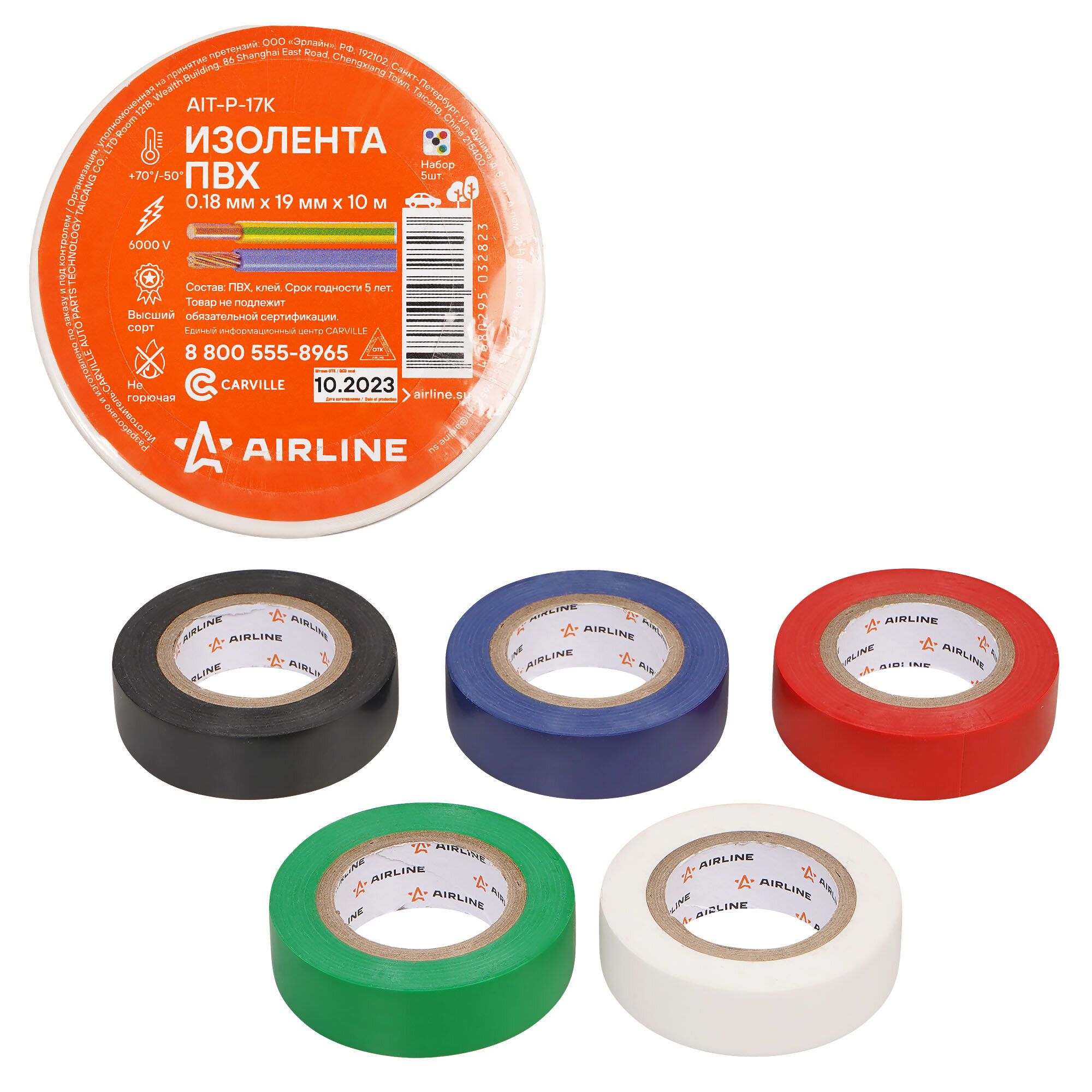 Купить Изолента ПВХ, набор 5 шт.(син, чёр, кр, зел, бел.), 19 мм*10 м AIT-P-17K AIRLINE