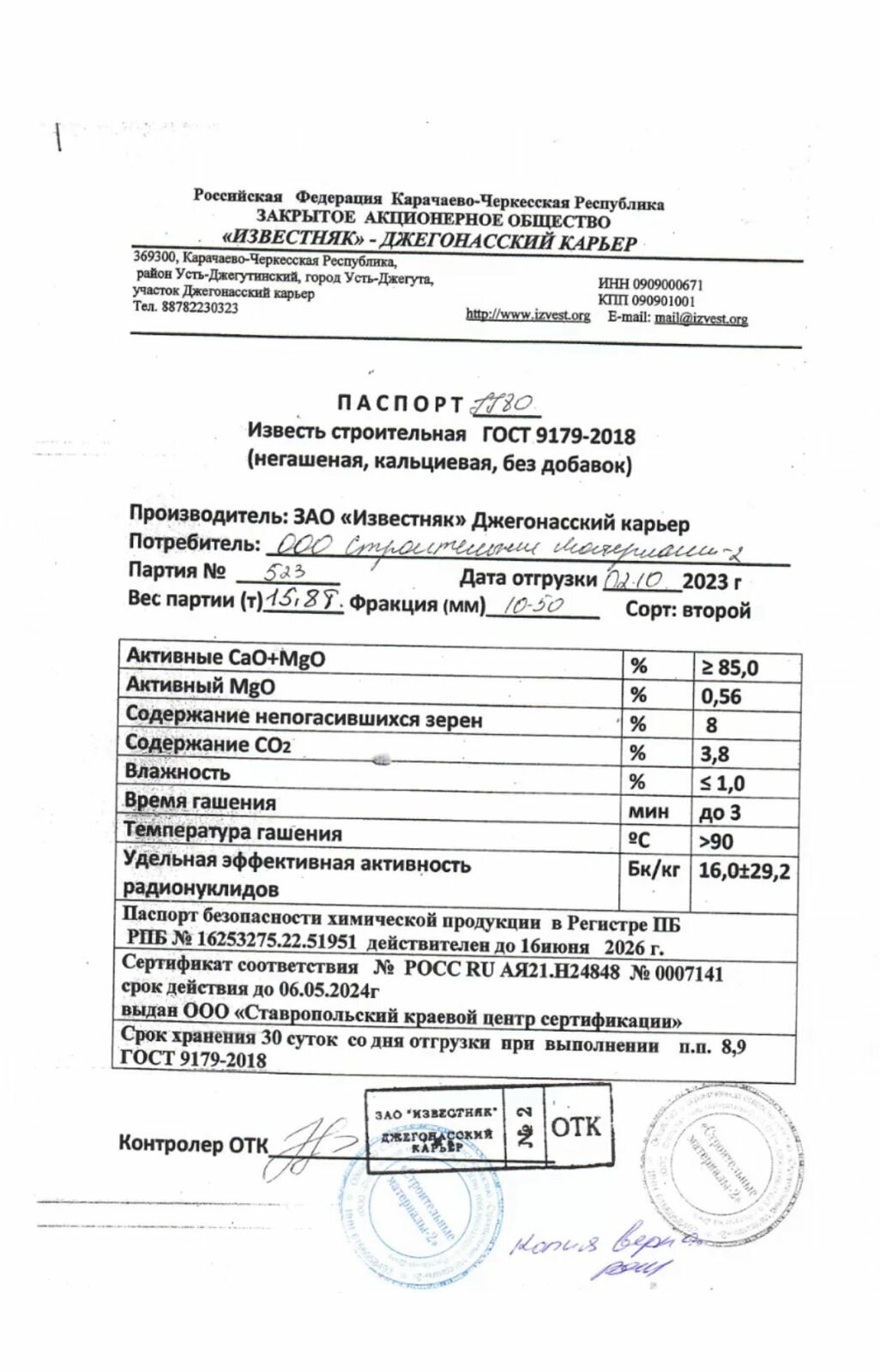 | Вид извести | негашеная |