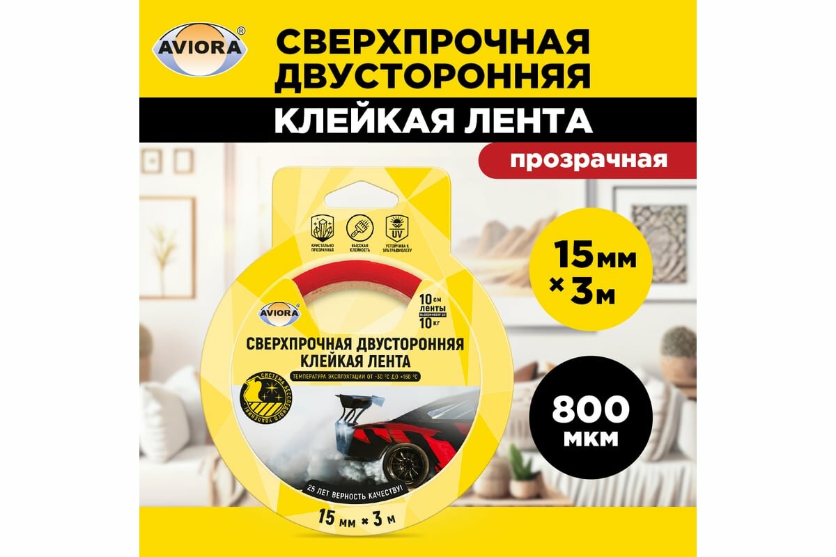 Скотч двусторонний сверхпрочный Aviora, акриловая основа, 15 мм x 3 м, белый