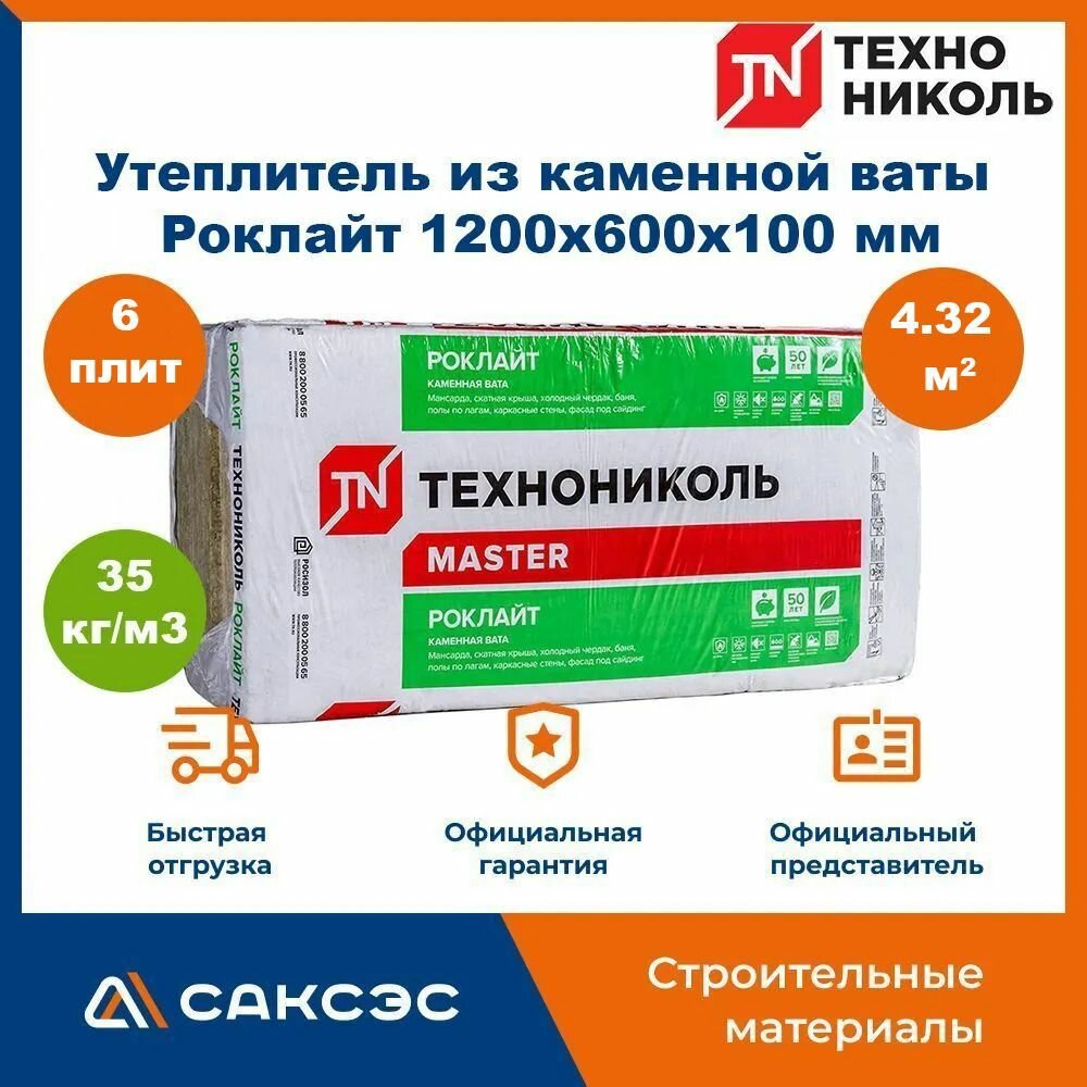 Утеплитель технониколь роклайт 100 мм 6 плит 1200х600х100мм, минеральная вата (каменная вата), площадь в упаковке 4.32 м2, плотность 35 кг/м3