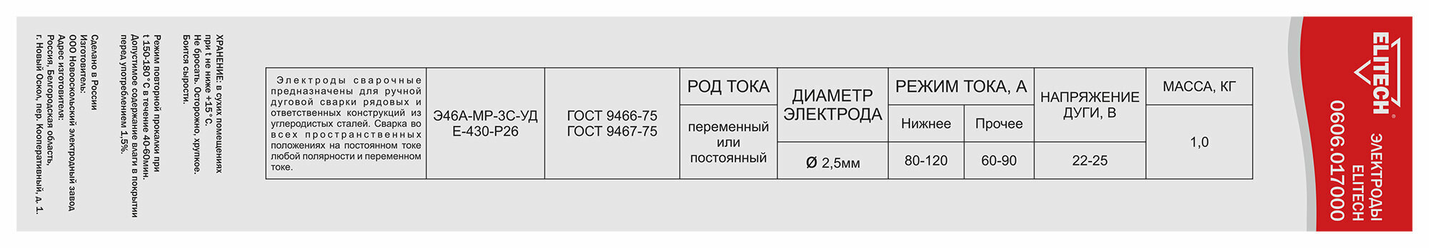 | Дополнительная информация | Электрод сварочный для стали Elitech МР-3С 2.5 мм 1 кг |