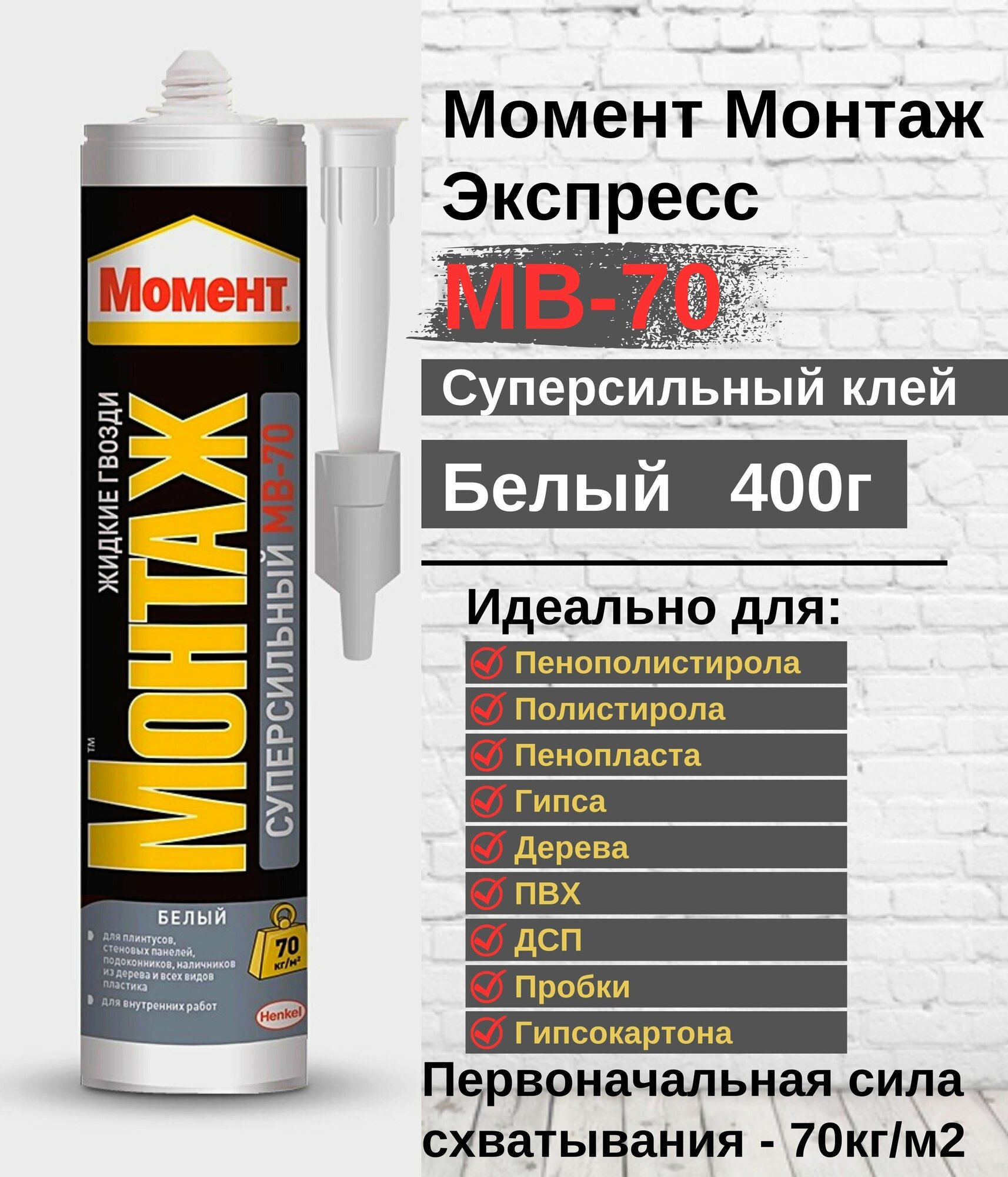 Ниже Вы можете прочитать отзывы на Момент Монтаж Суперсильный MB-70 клей монтажный (0,4кг) / момент Монтаж Суперсильный МВ-70 жидкие гвозди (картридж 400г) белый, ознакомится с подробными характеристиками, посмотреть интересные обзоры и фотографии на Момент Монтаж Суперсильный MB-70 клей монтажный (0,4кг) / момент Монтаж Суперсильный МВ-70 жидкие гвозди (картридж 400г) белый.