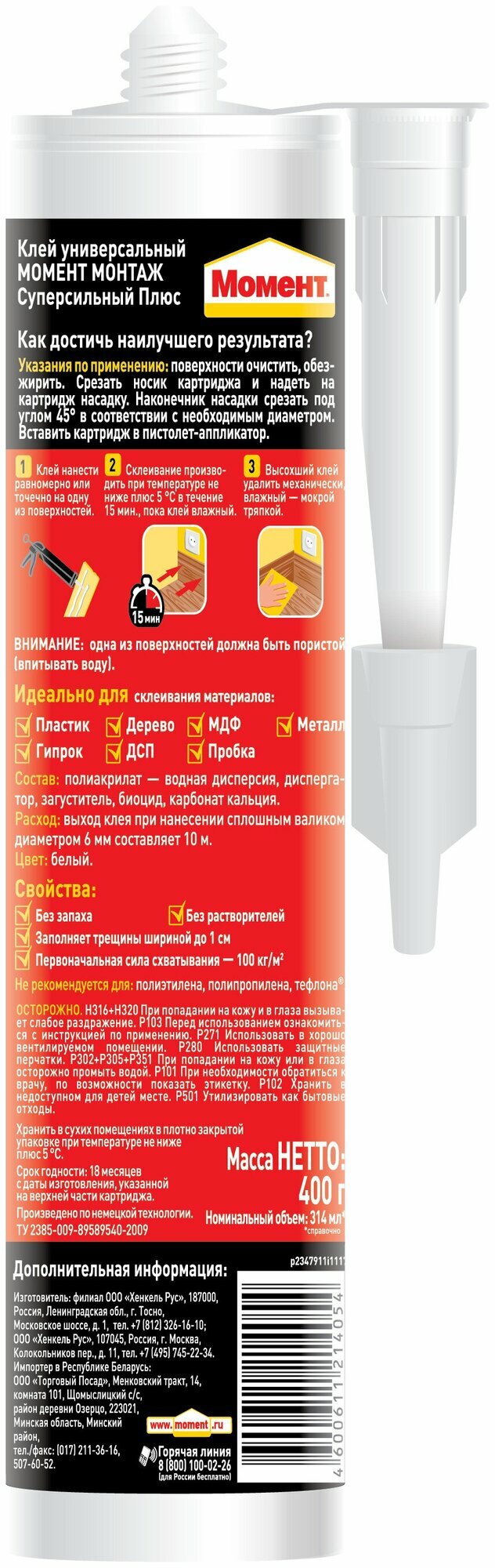Монтажный клей Момент Монтаж Суперсильный Плюс МВ-100 (400 г) 1 шт.