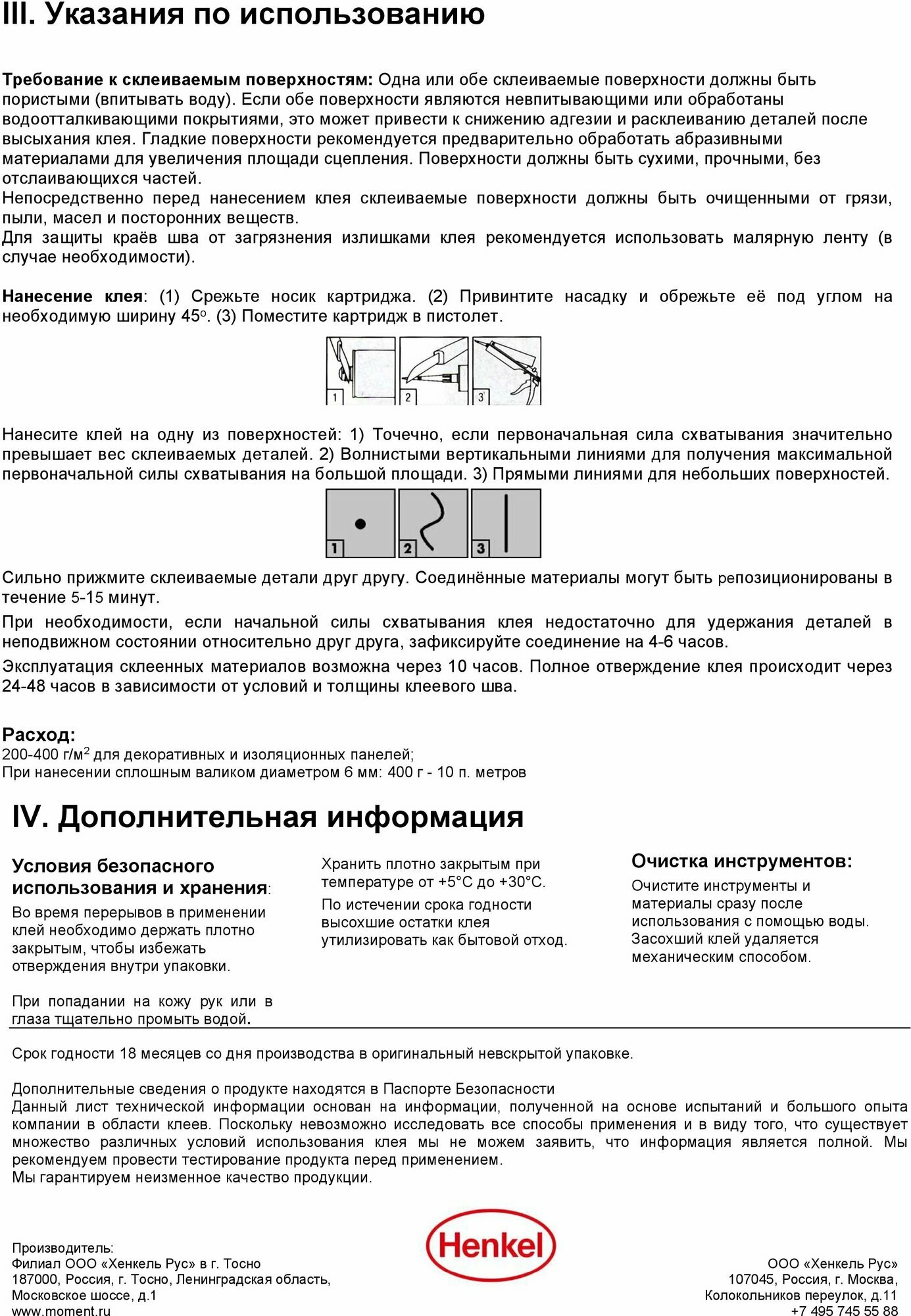| Дополнительная информация | 200-400 г/кв.м для декоративных и изоляционных панелей, 20-40 г/м для профилей, панелей из дерева; при нанесении сплошным валиком диаметром 6 мм: 10 п. метров - 400 г |