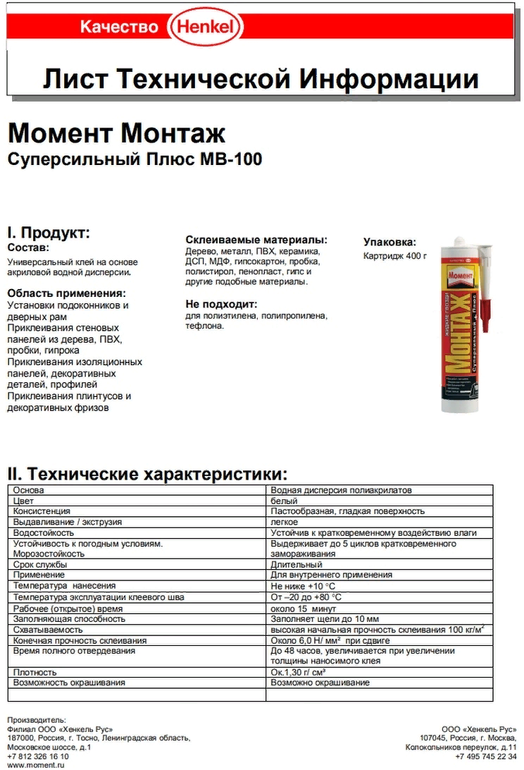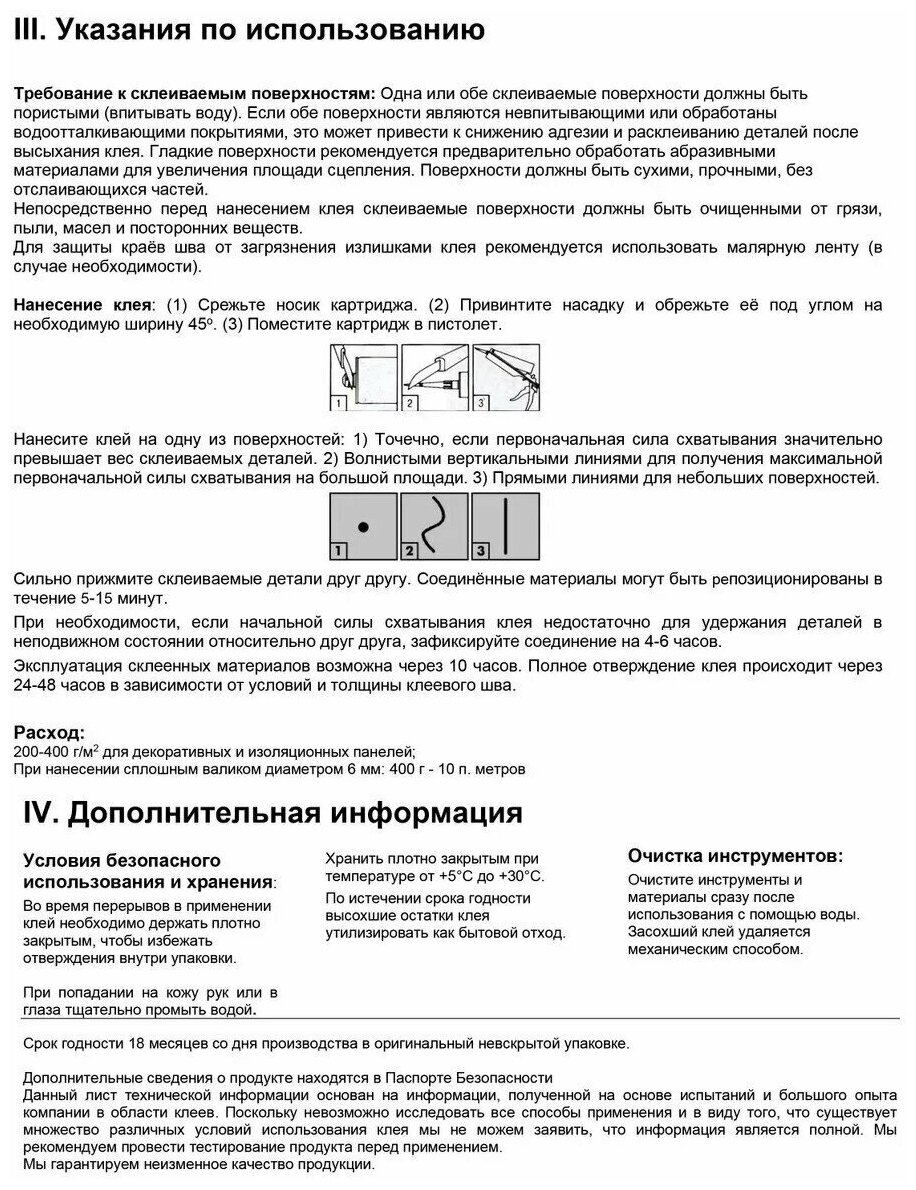 | Дополнительная информация | 200-400 г/кв.м для декоративных и изоляционных панелей, 20-40 г/м для профилей, панелей из дерева; при нанесении сплошным валиком диаметром 6 мм: 10 п. метров - 400 г |