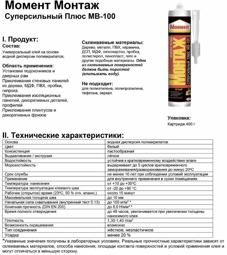 | Дополнительная информация | 200-400 г/кв.м для декоративных и изоляционных панелей, 20-40 г/м для профилей, панелей из дерева; при нанесении сплошным валиком диаметром 6 мм: 10 п. метров - 400 г |