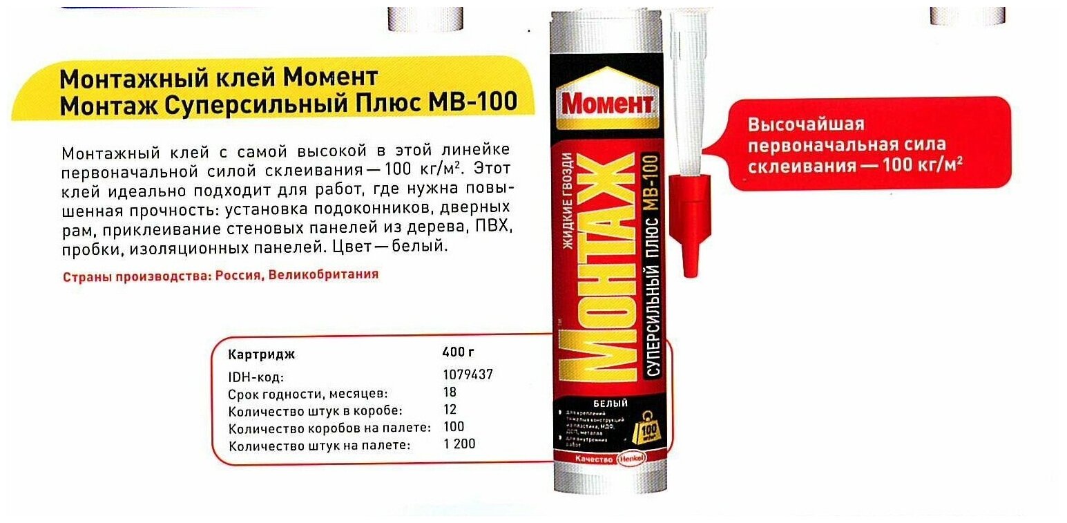 Монтажный клей Момент Монтаж Суперсильный Плюс МВ-100 (380 г) 0.4 л 12 шт .