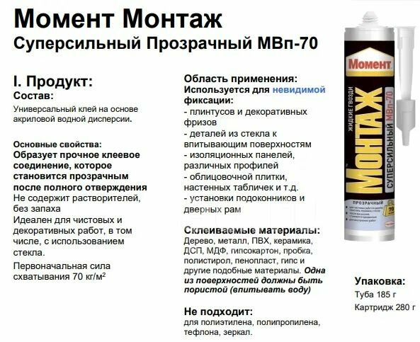 Ниже Вы можете прочитать отзывы на Монтажный клей Момент Монтаж Суперсильный МВп-70 (280 г) 0.27 л картридж, ознакомится с подробными характеристиками, посмотреть интересные обзоры и фотографии на Монтажный клей Момент Монтаж Суперсильный МВп-70 (280 г) 0.27 л картридж.