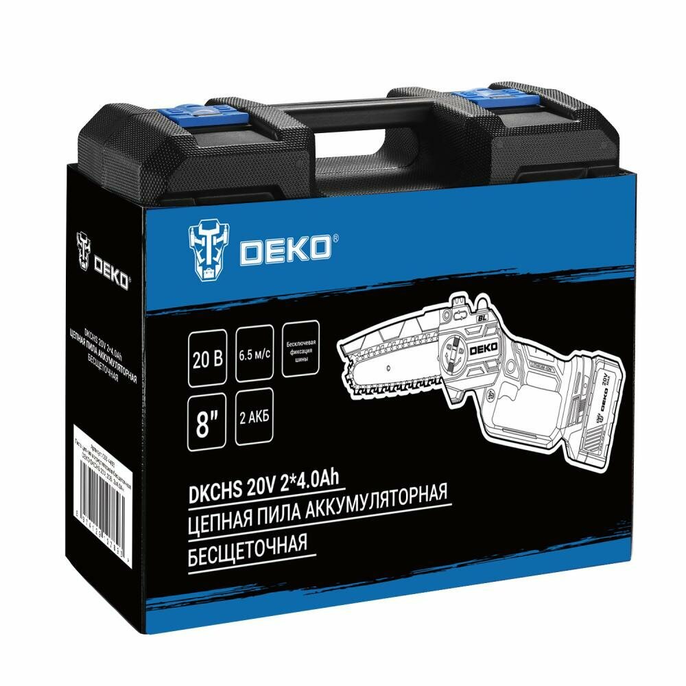 Пила цепная аккумуляторная бесщеточная в кейсе DEKO DKCHS 20, 10", 20В, 2x4.0Ач, з/у