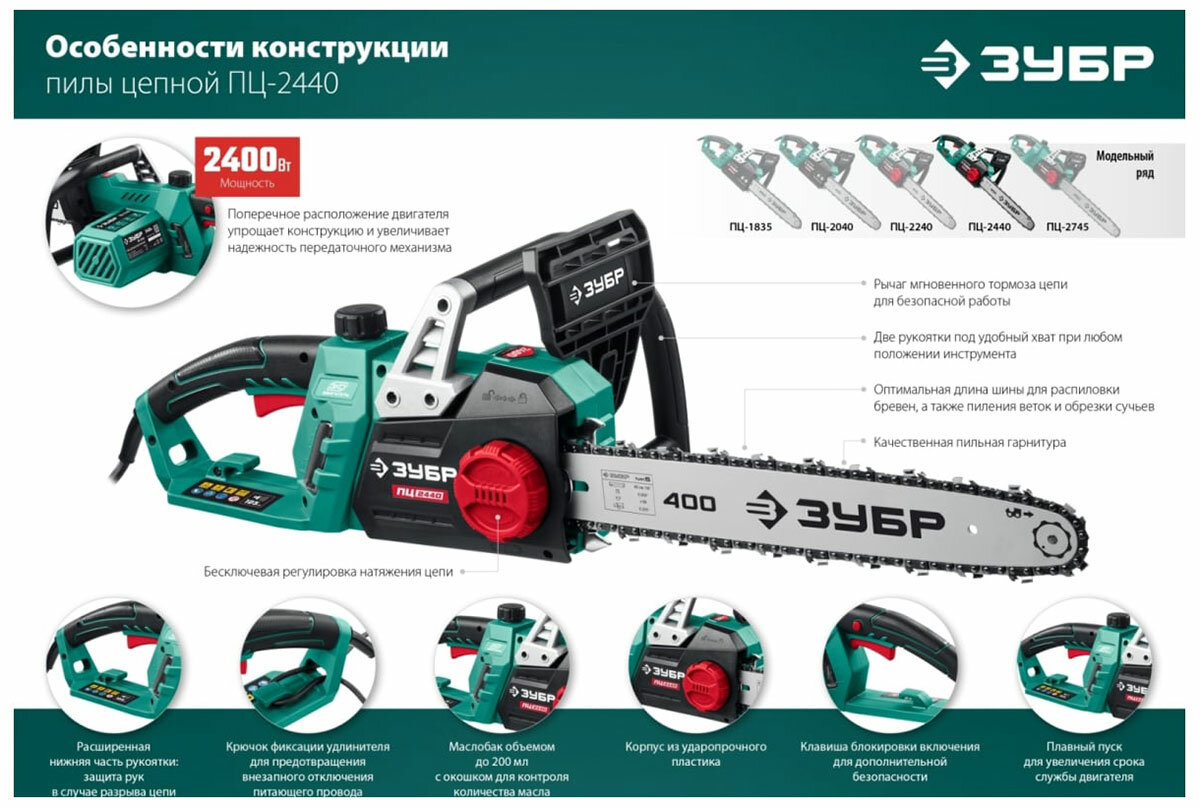 СохранитьЗУБР 2400 Вт, 40 см шина, электрическая цепная пила (ПЦ-2440) интересное: