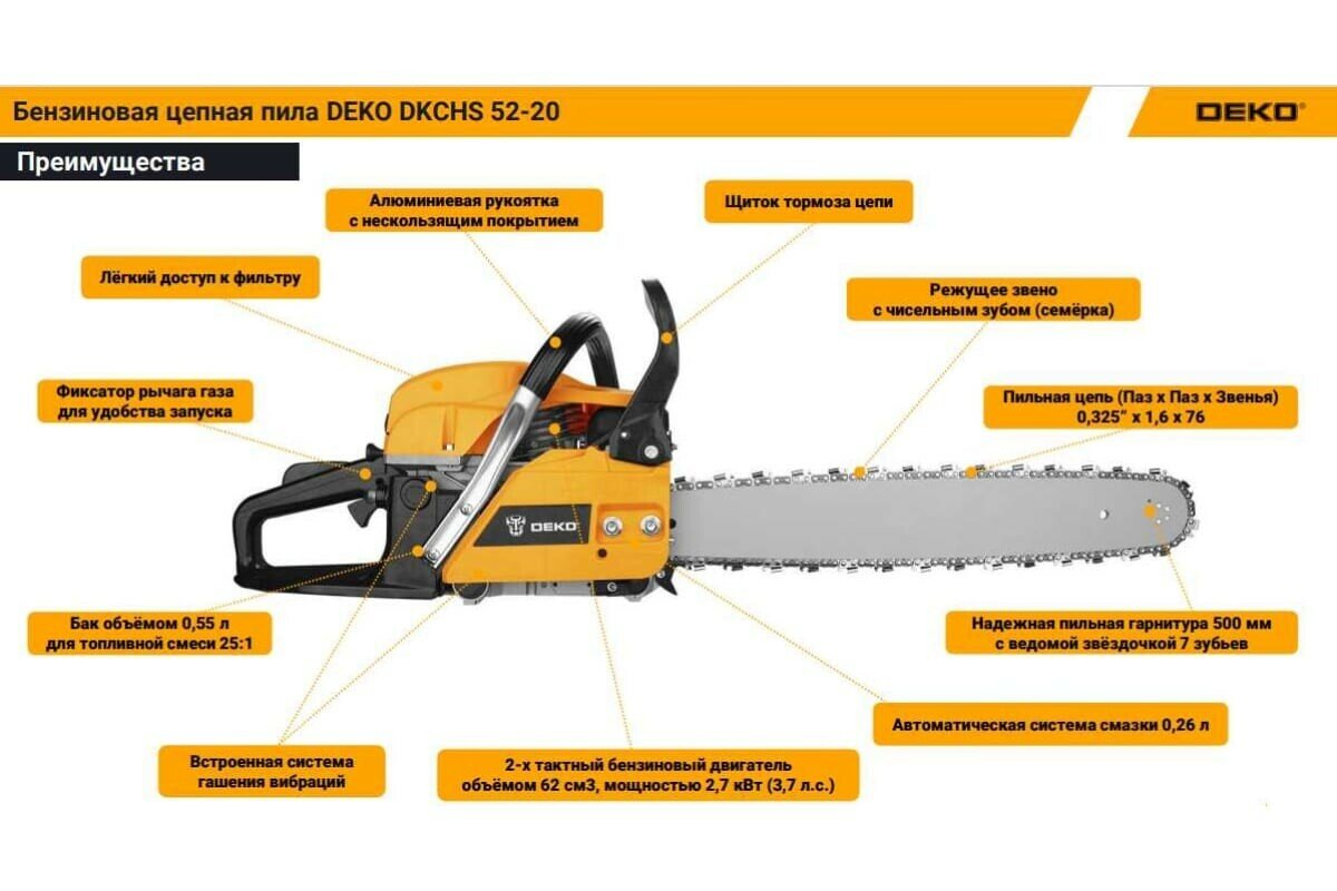 Бензопила Deko DKCHS 62-20, 3.7 л. с, 62 куб. см, 20" (065-1225) интересное: