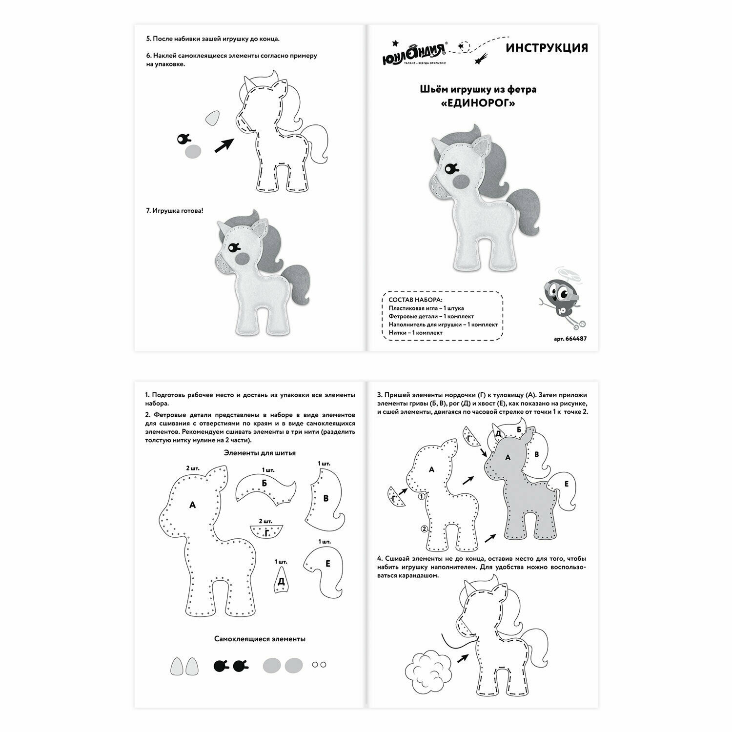 СохранитьНабор для творчества и рукоделия для шитья игрушки из фетра для девочек / детей Единорог, Юнландия, 664487 интересное:
