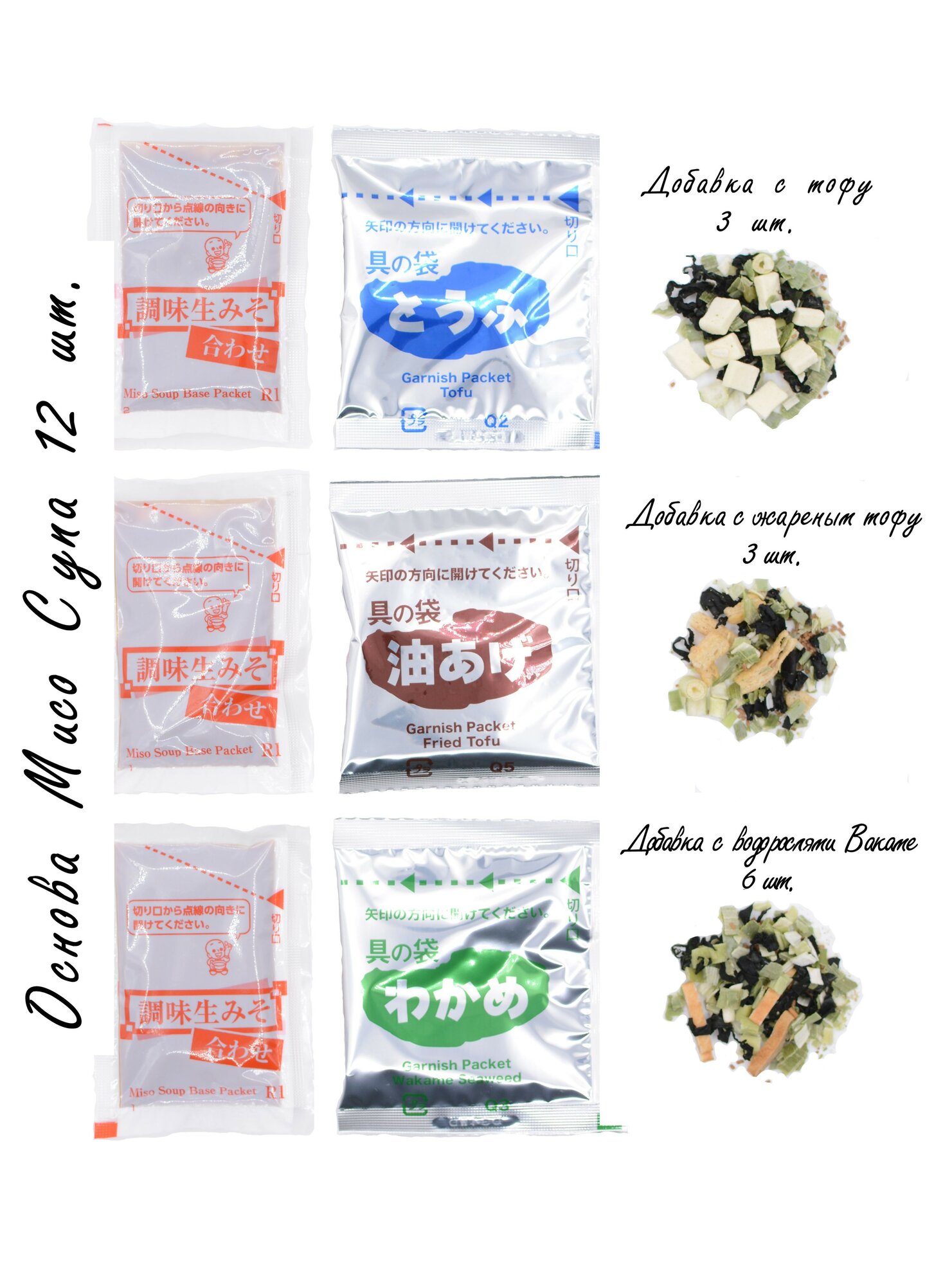 | Дополнительная информация | в наборе 6 супов с водорослями вакаме, 3 супа с тофу, 3 супа с жареным тофу |