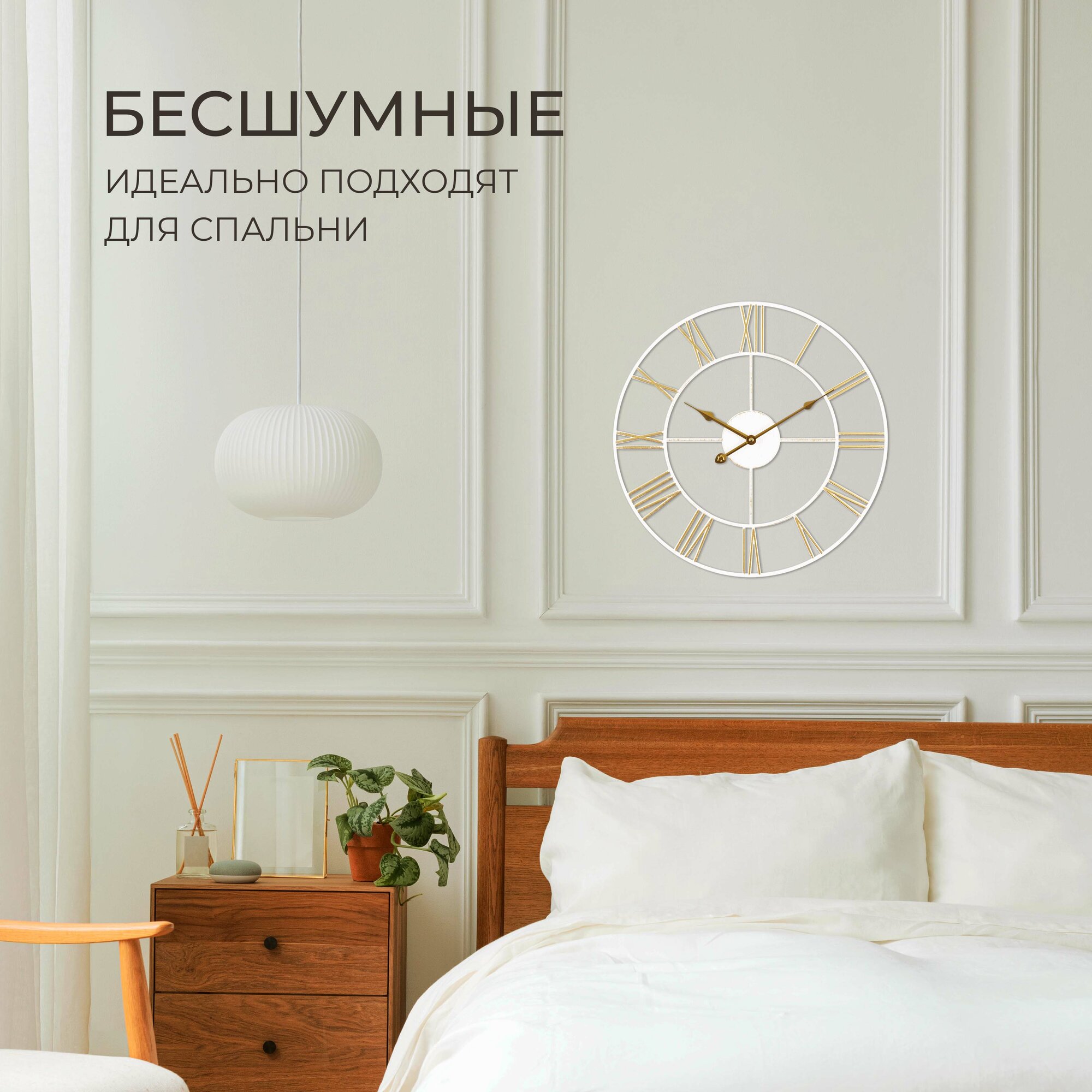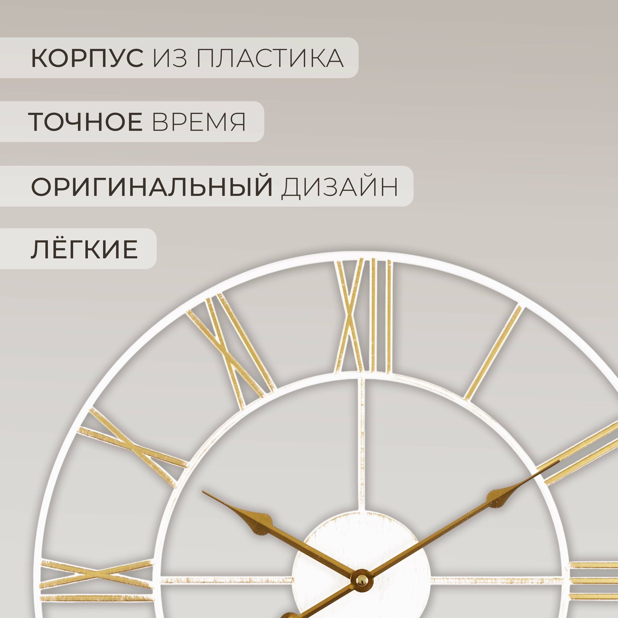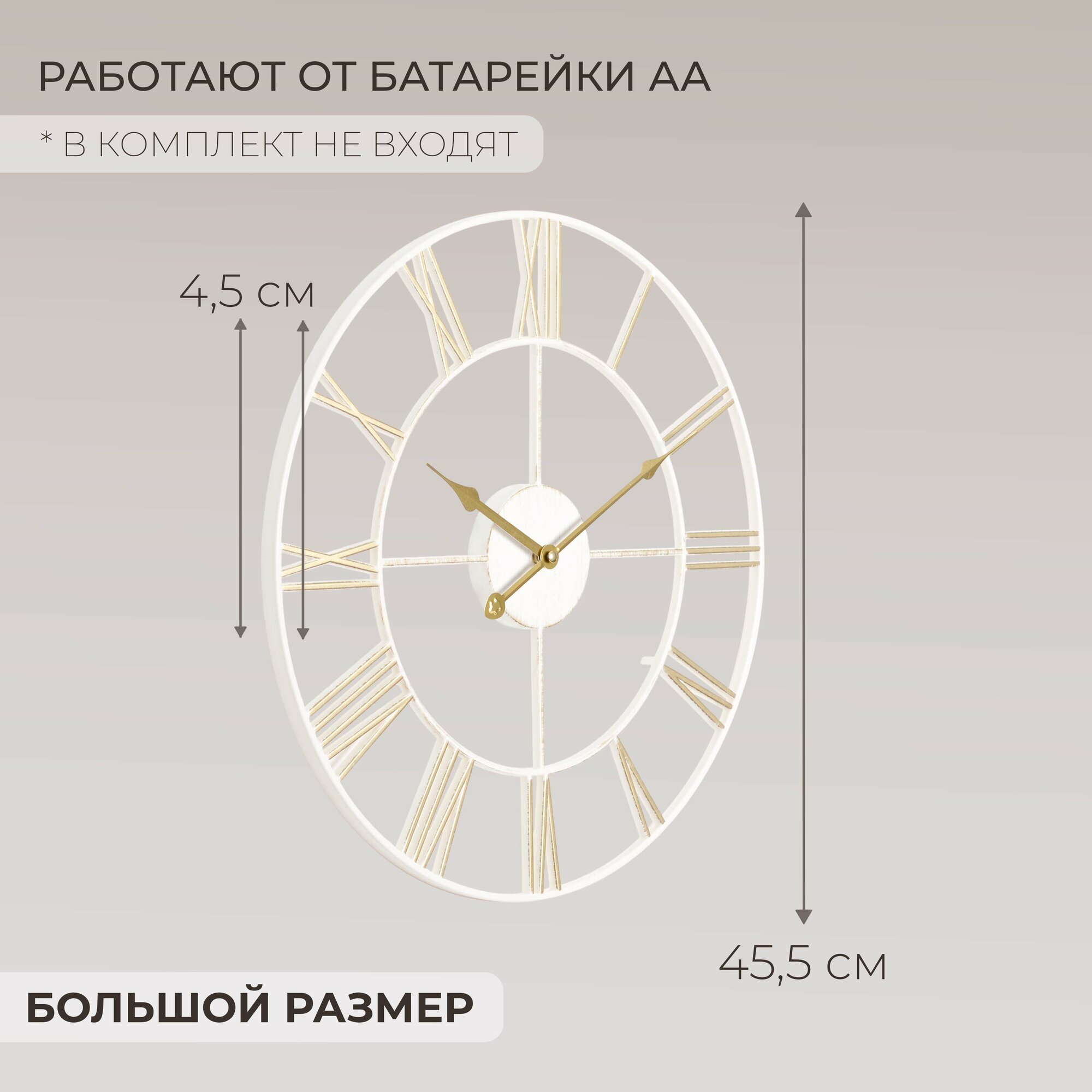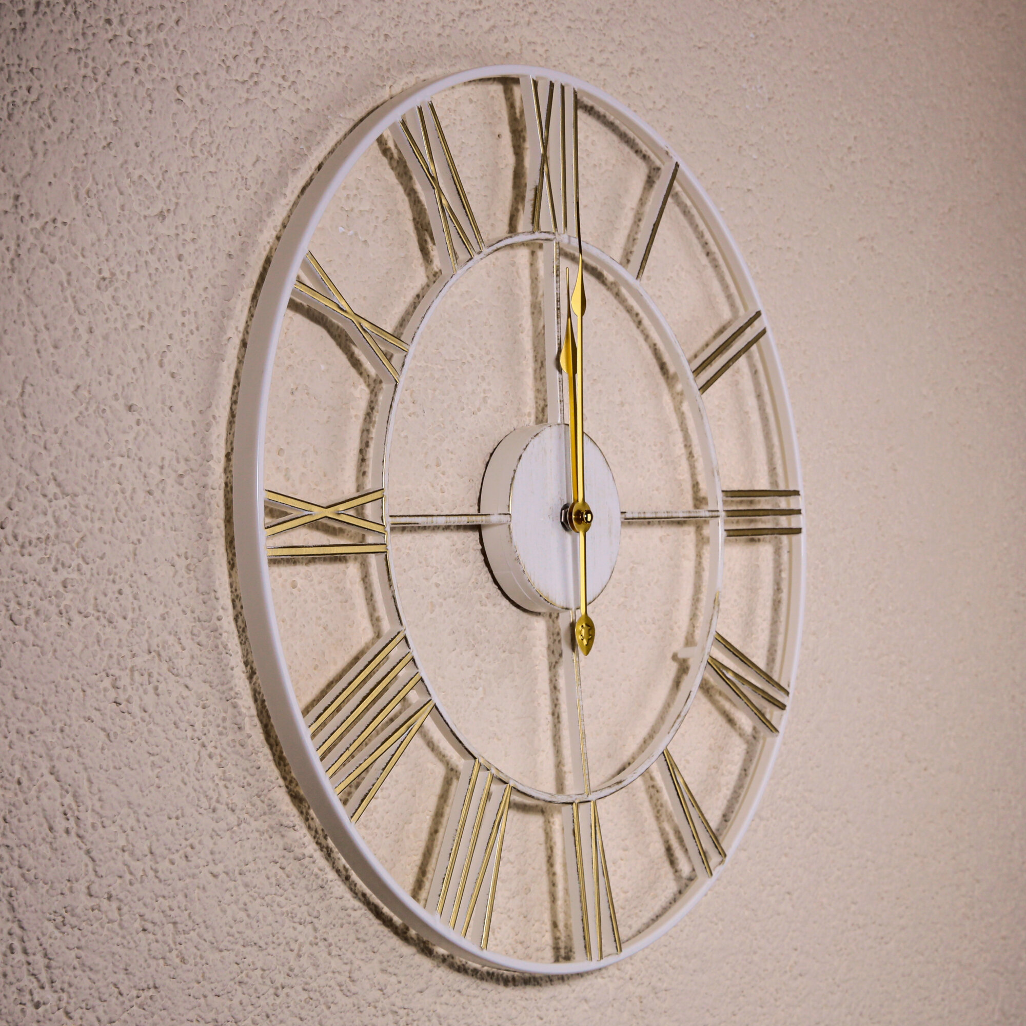 Большие настенные часы Лофт, бесшумные часы d=48 см, часы с римскими цифрами, открытая стрелка, Белый Золото