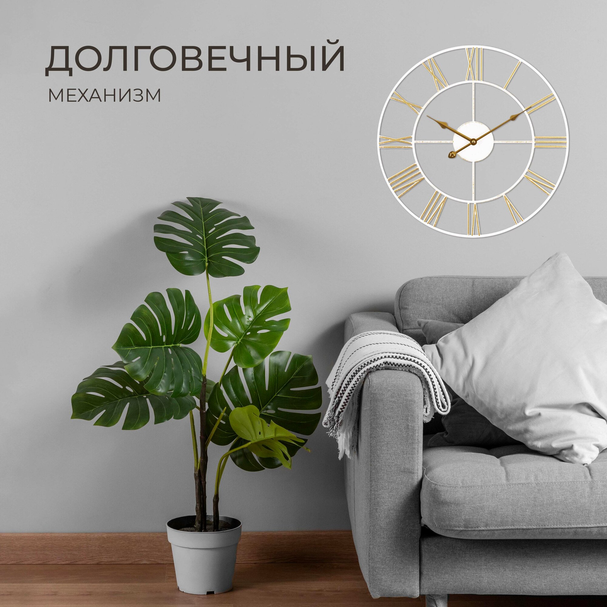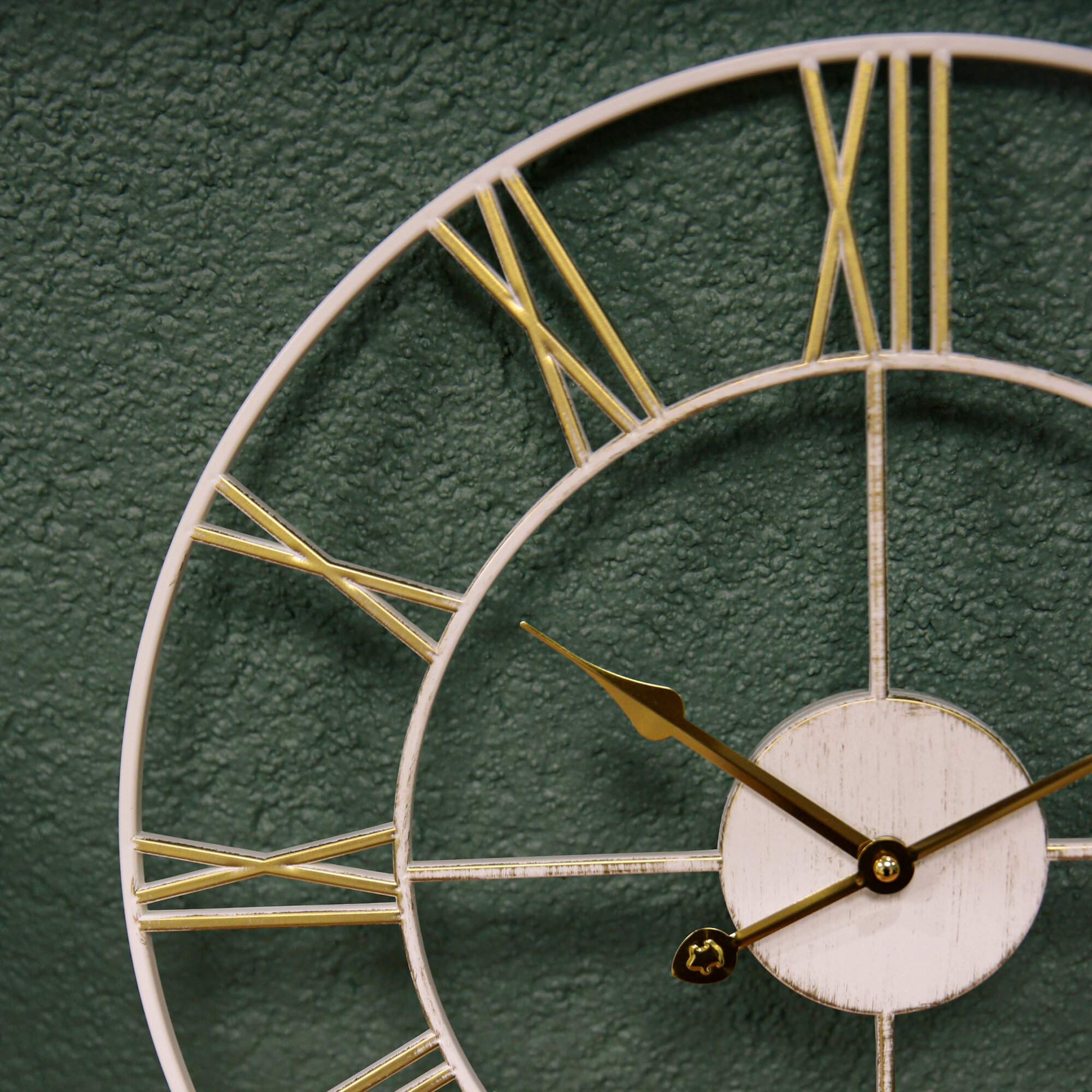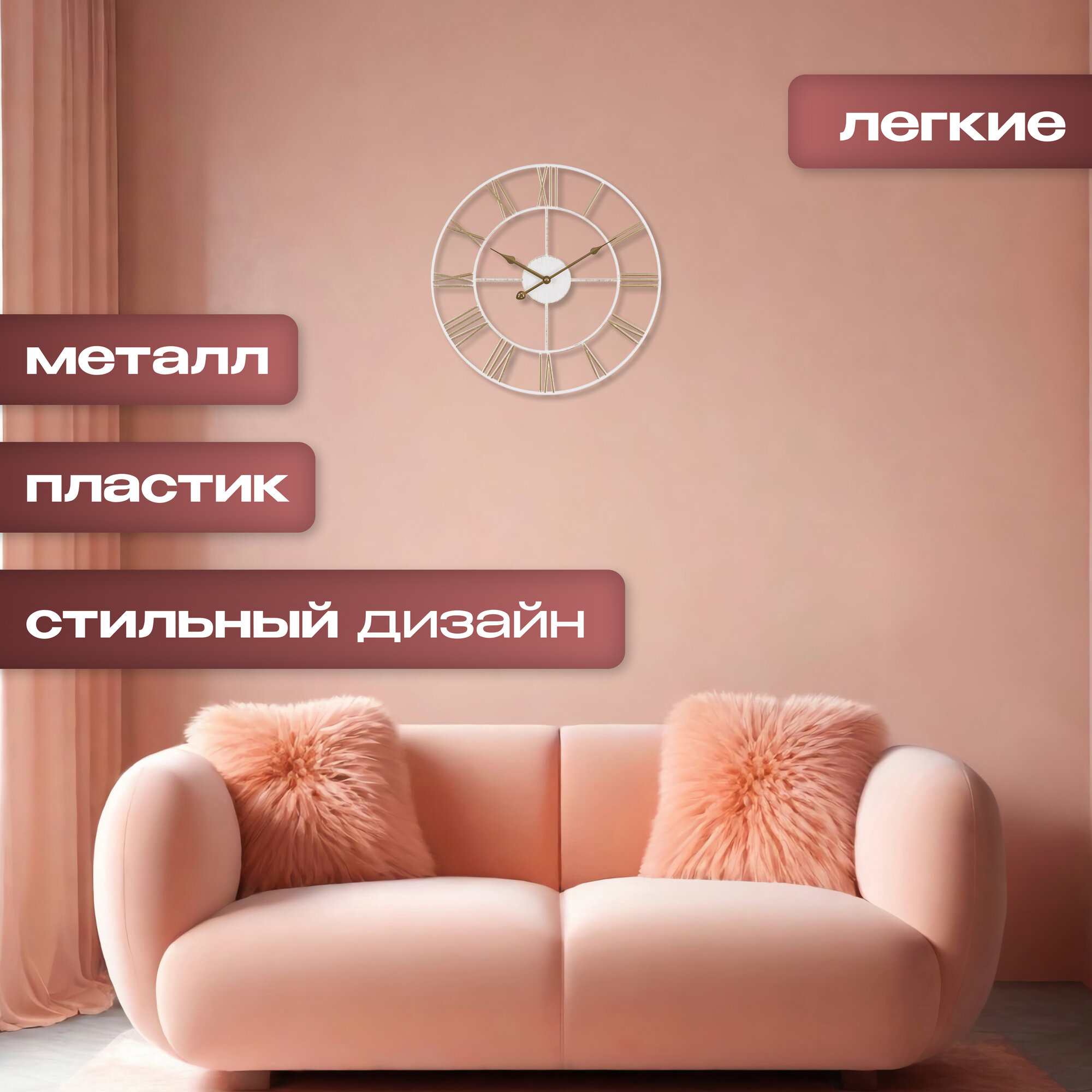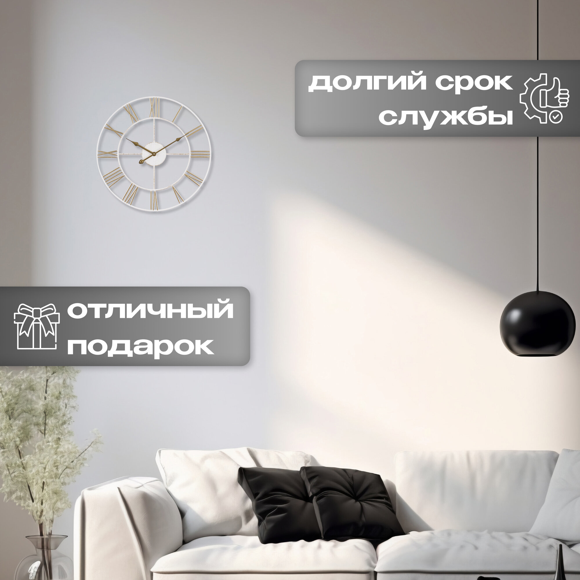 Большие настенные часы Лофт, бесшумные часы d=48 см, часы с римскими цифрами, открытая стрелка, Белый Золото