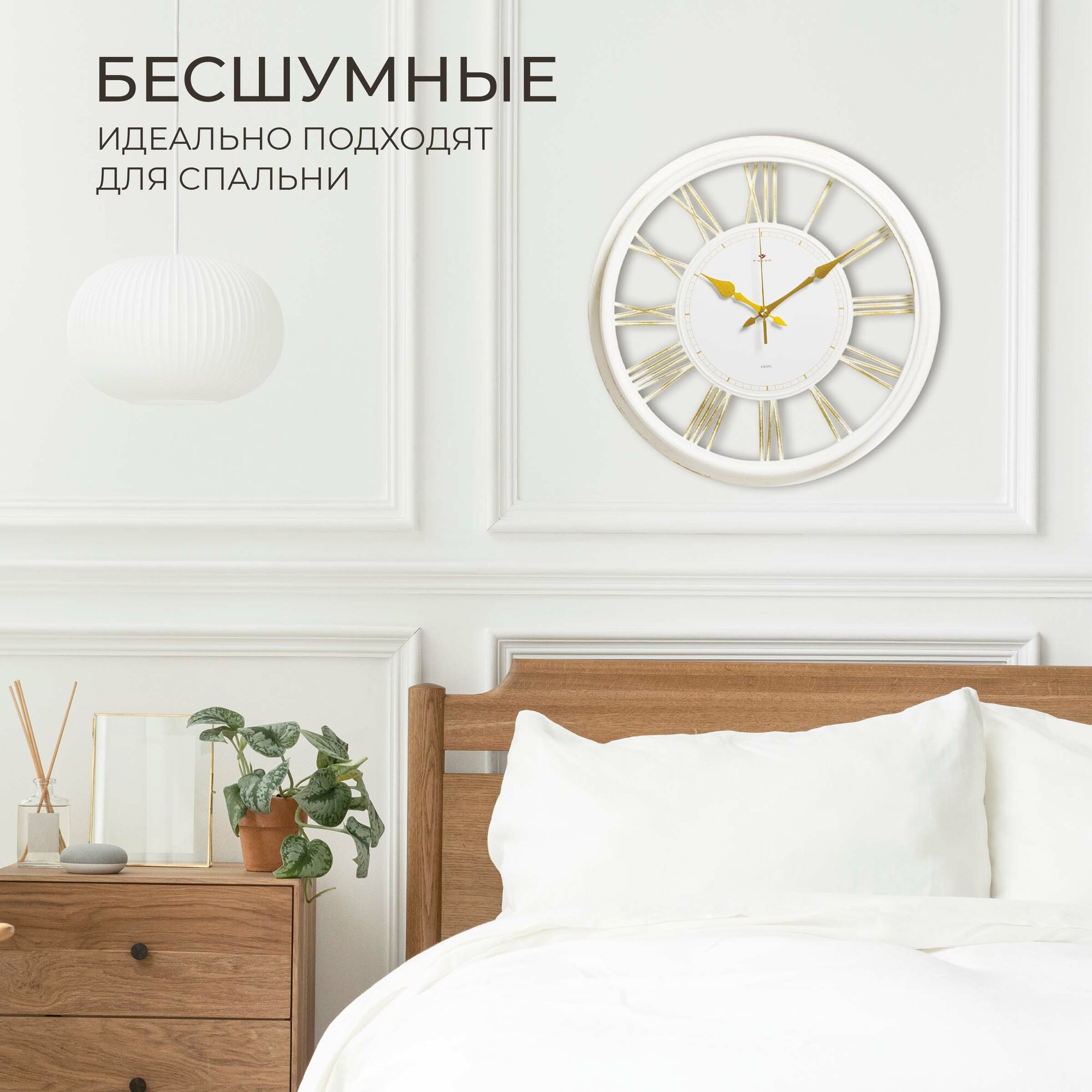Большие настенные часы Лофт, бесшумные часы d=48 см, часы с римскими цифрами, открытая стрелка, Белый Золото