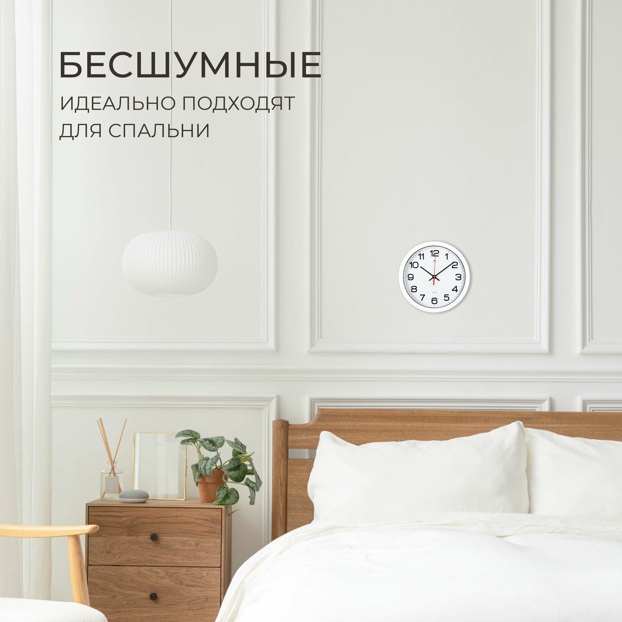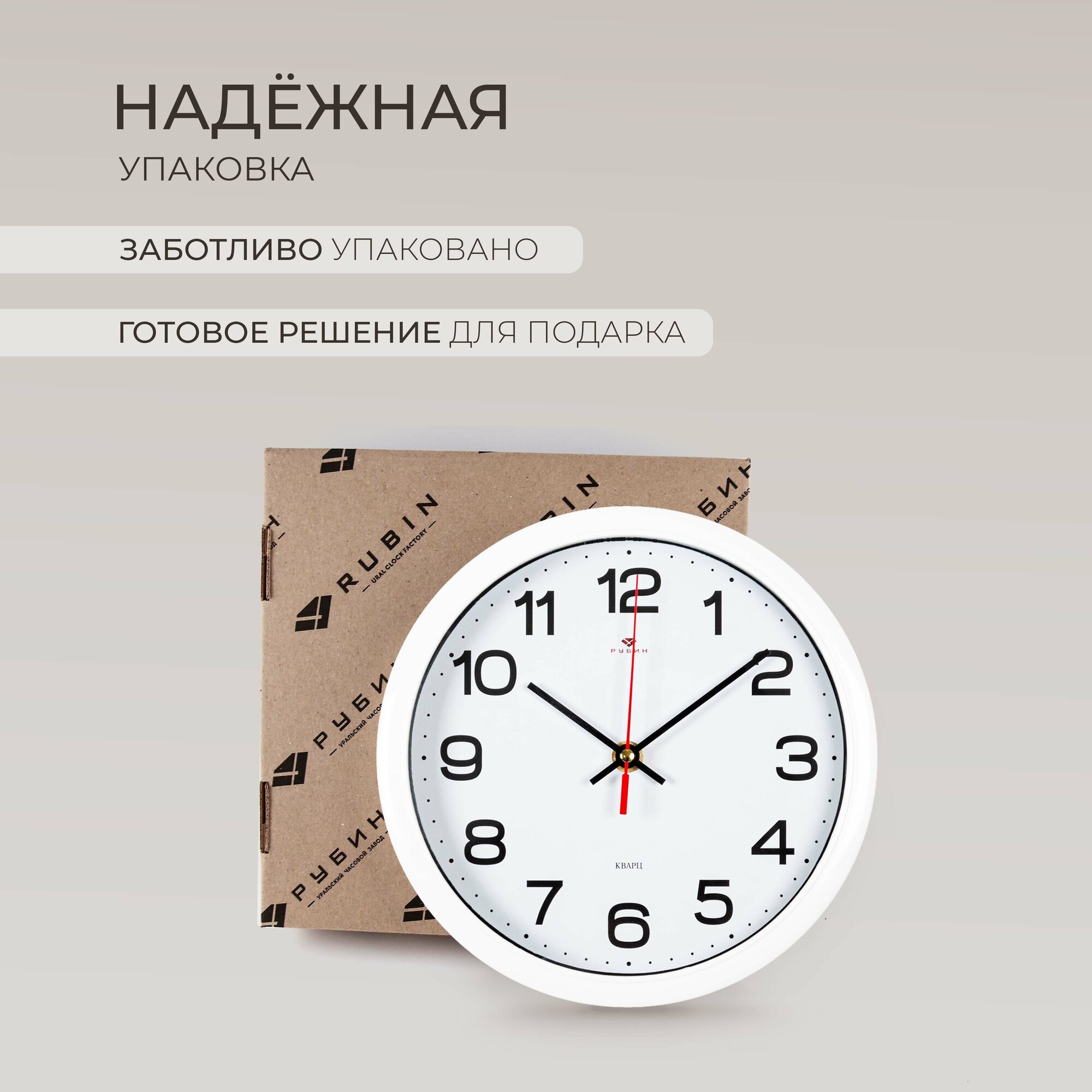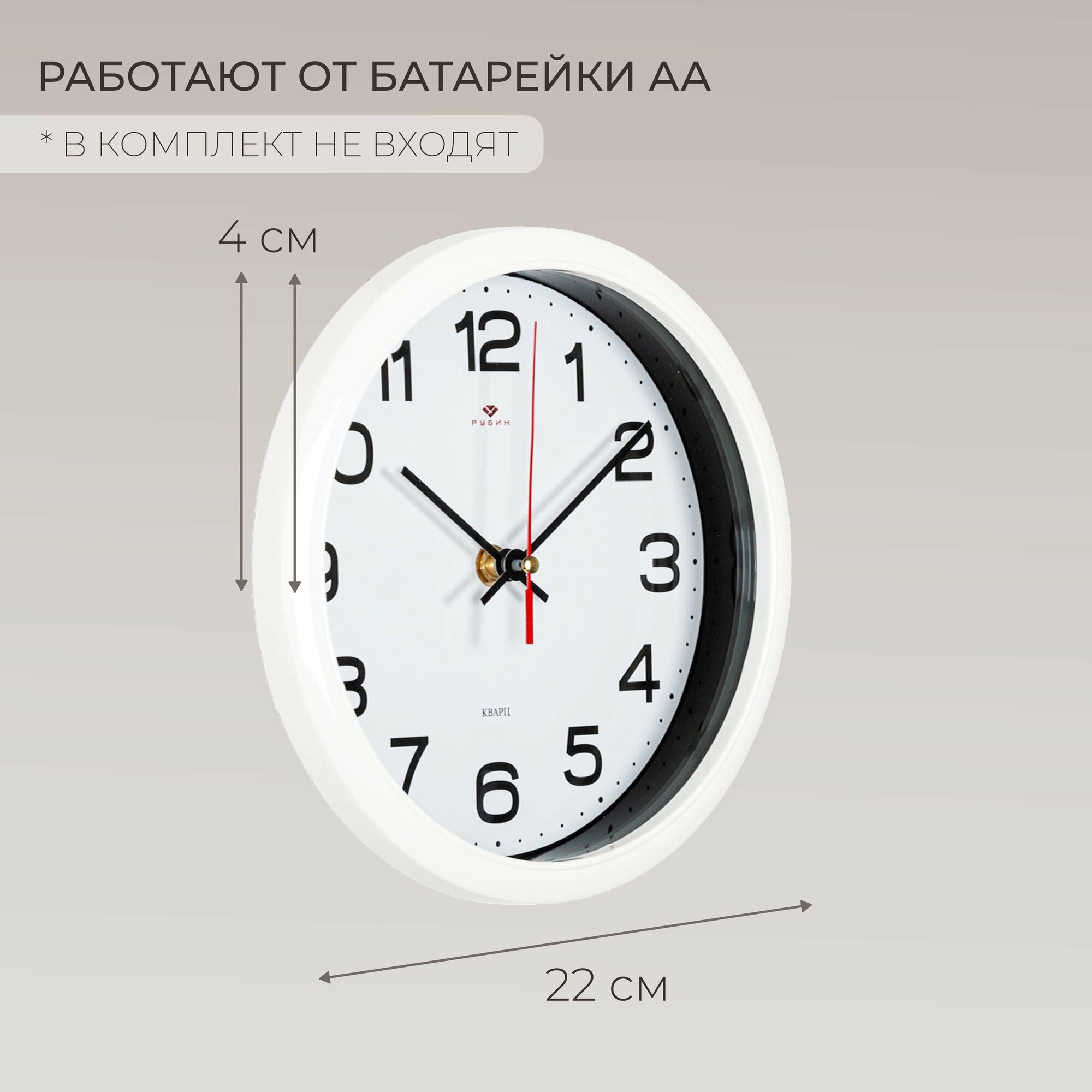 Часы настенные, кварцевые, белые, бесшумные, круглые, пластик, стекло, арабские цифры, Рубин