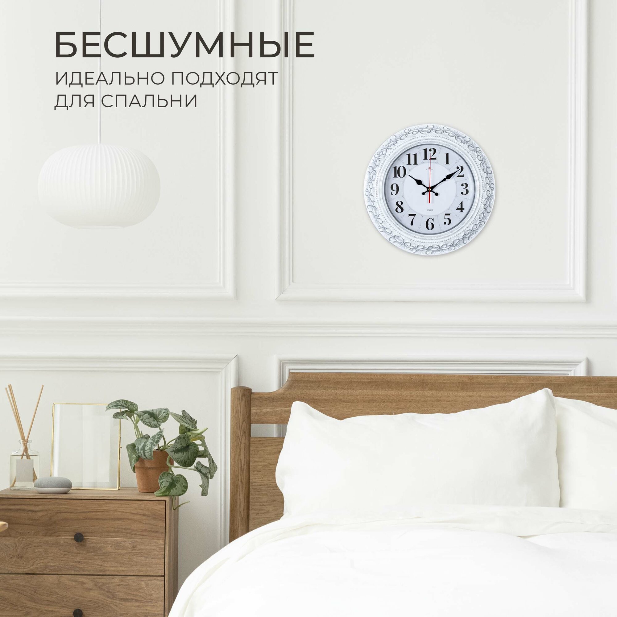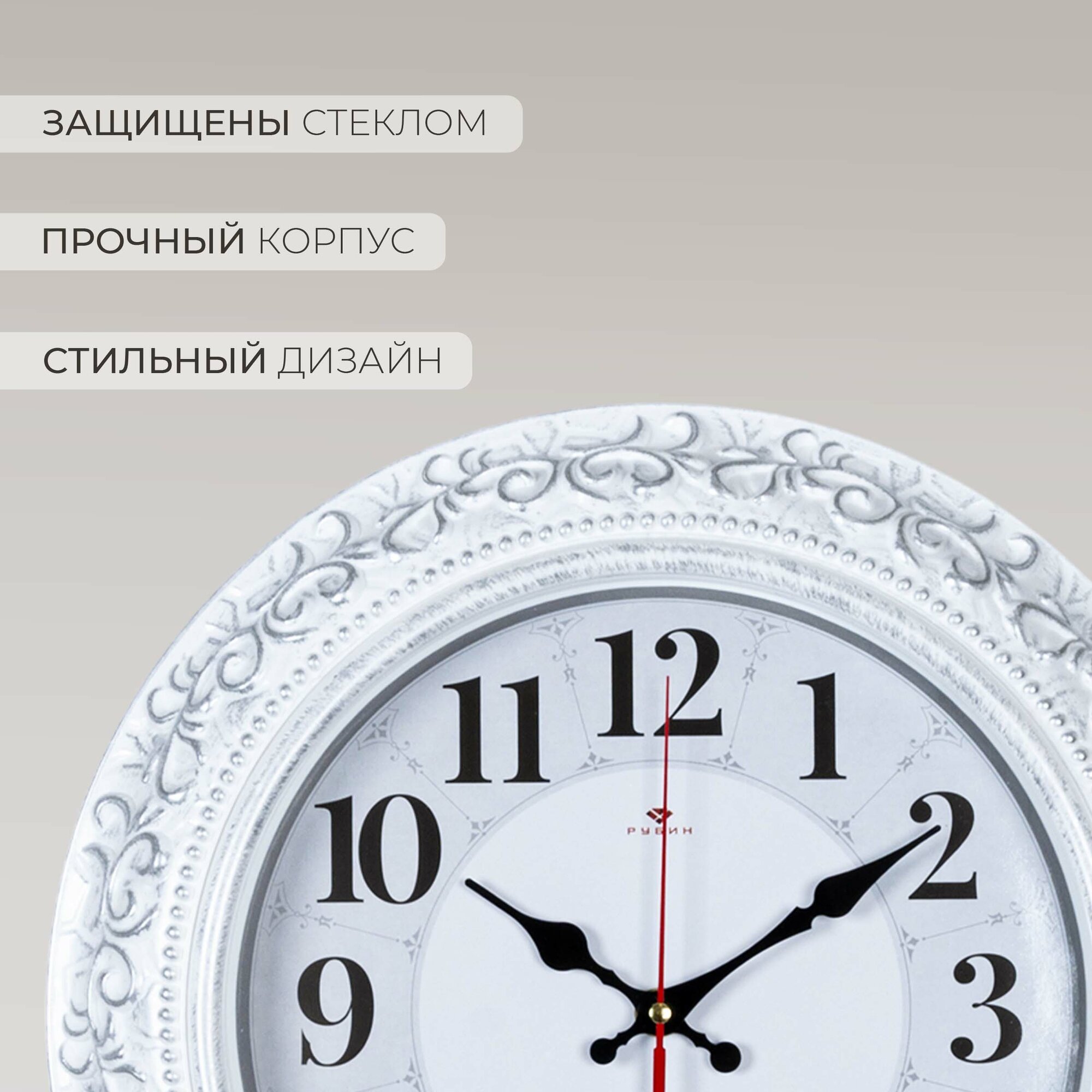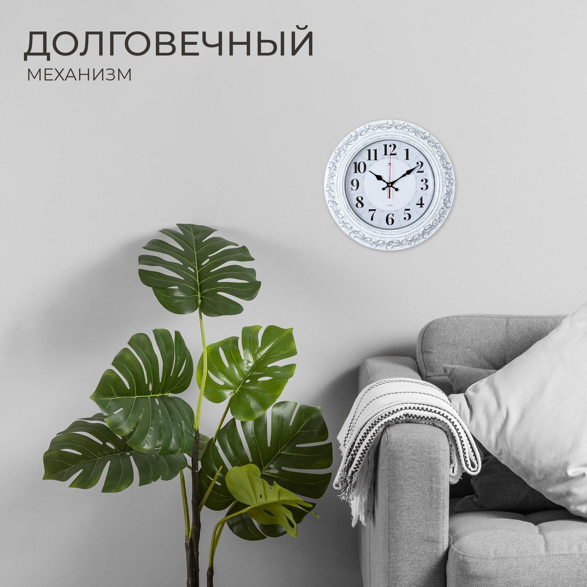 Часы настенные, кварцевые, белые, бесшумные, круглые, пластик, стекло, арабские цифры, Рубин