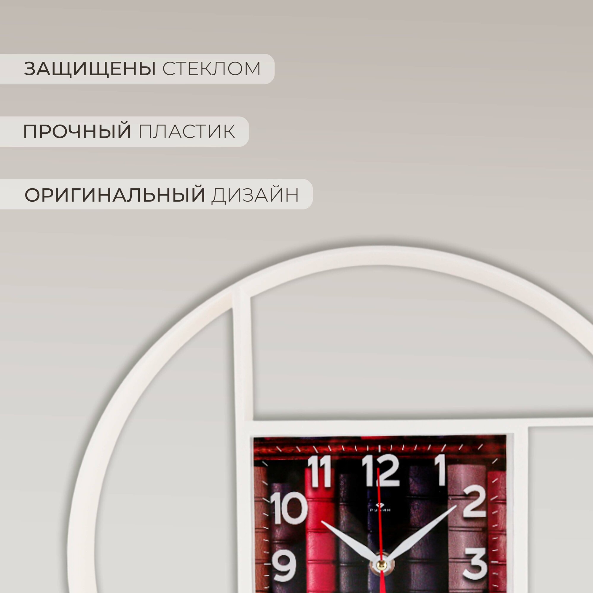Часы настенные, кварцевые, белые, бесшумные, круглые, пластик, стекло, арабские цифры, Рубин