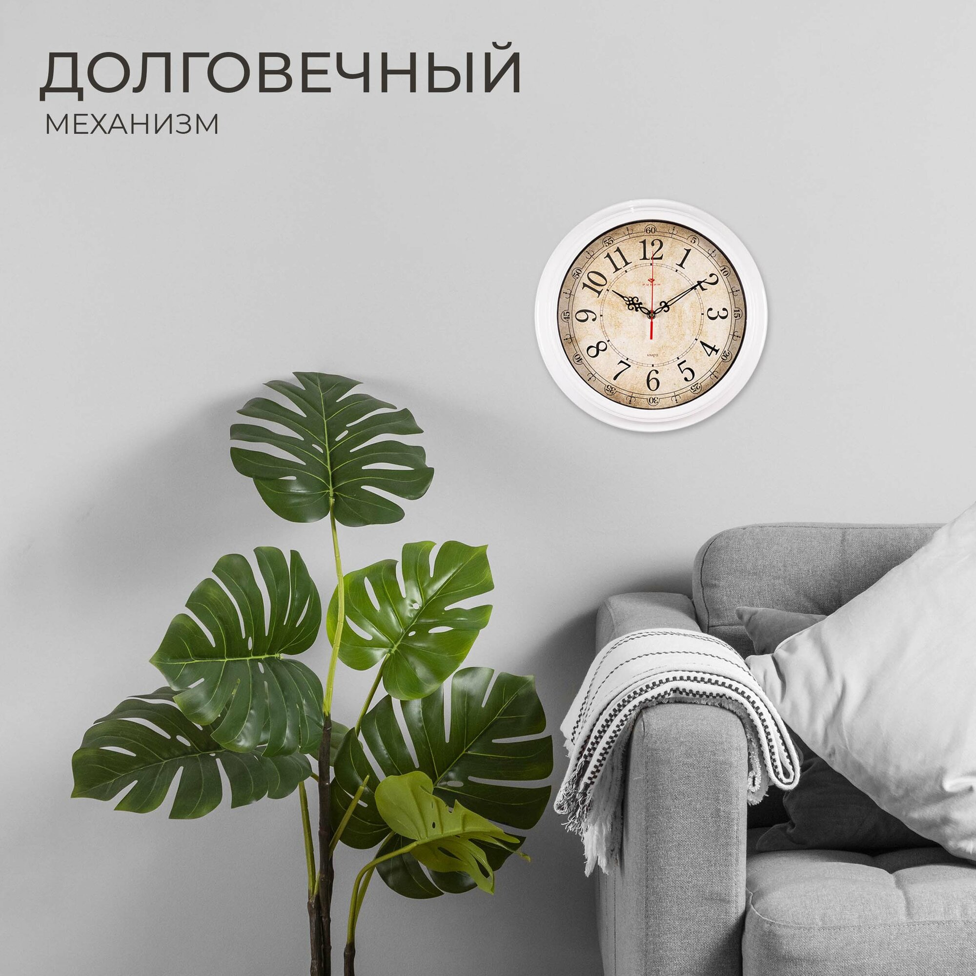 Часы настенные, кварцевые, белые, бесшумные, круглые, пластик, стекло, арабские цифры, Рубин