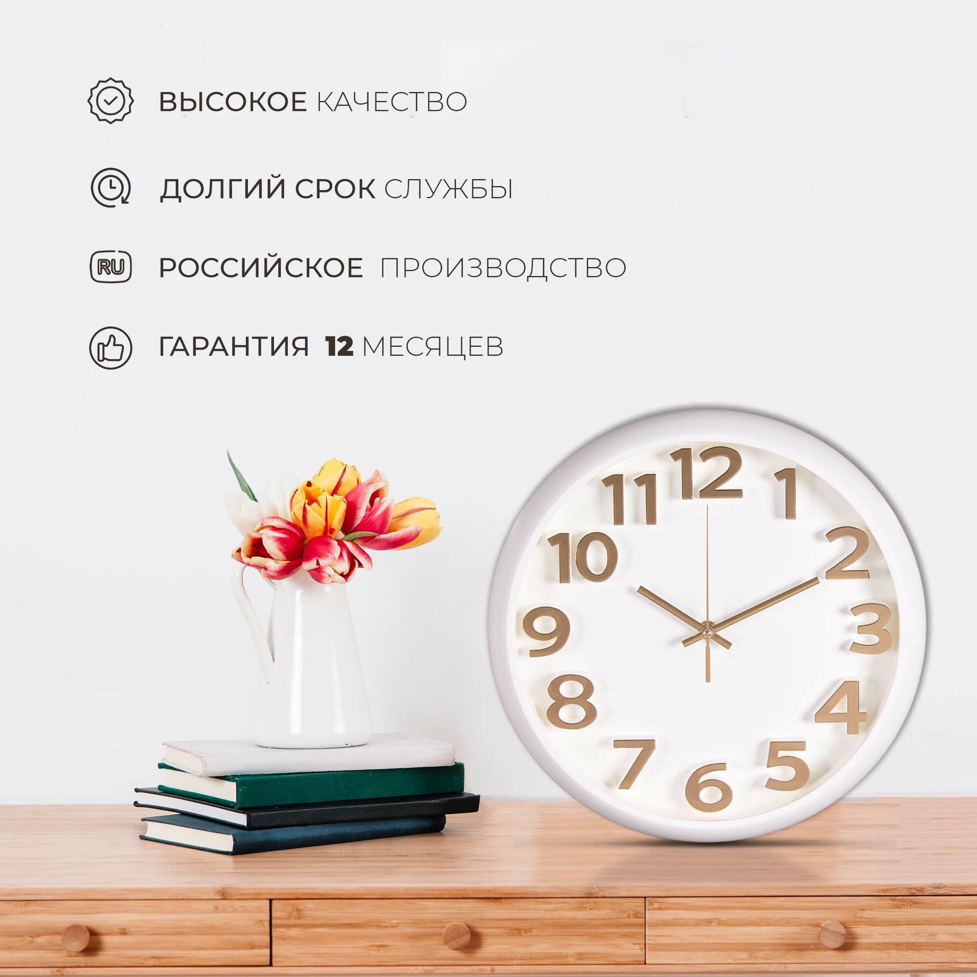 Стильные кварцевые часы в круглом корпусе Рубин Классика 3524-007 35 см с большими арабскими цифрами для украшения интерьера гостиной, спальни, кухни или офиса
