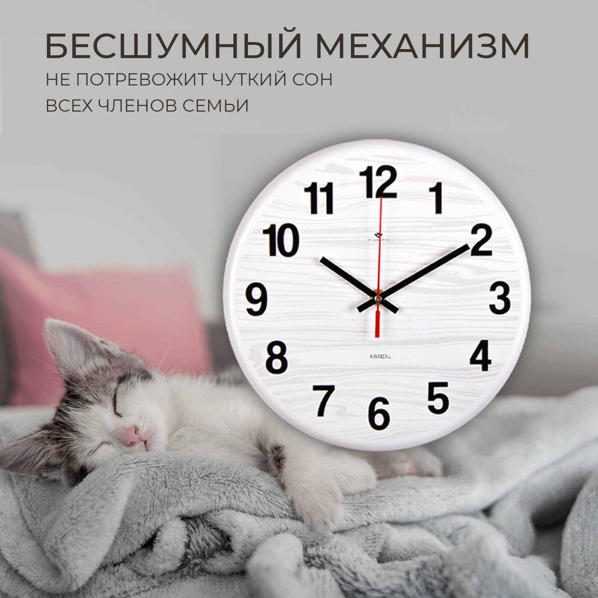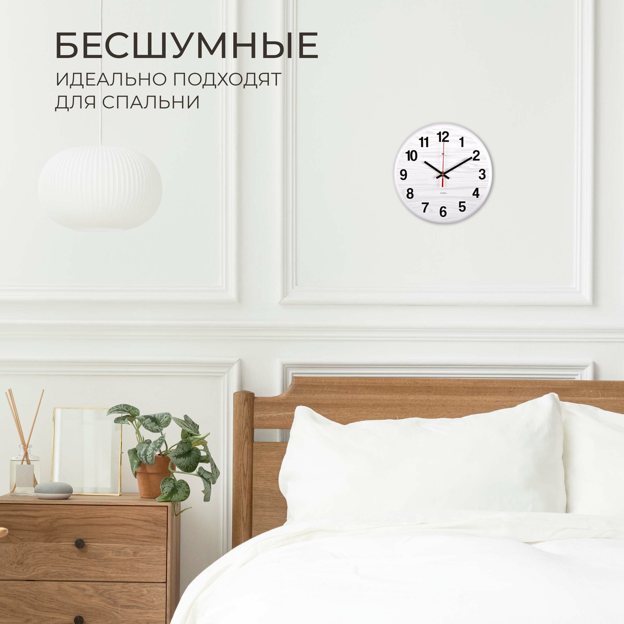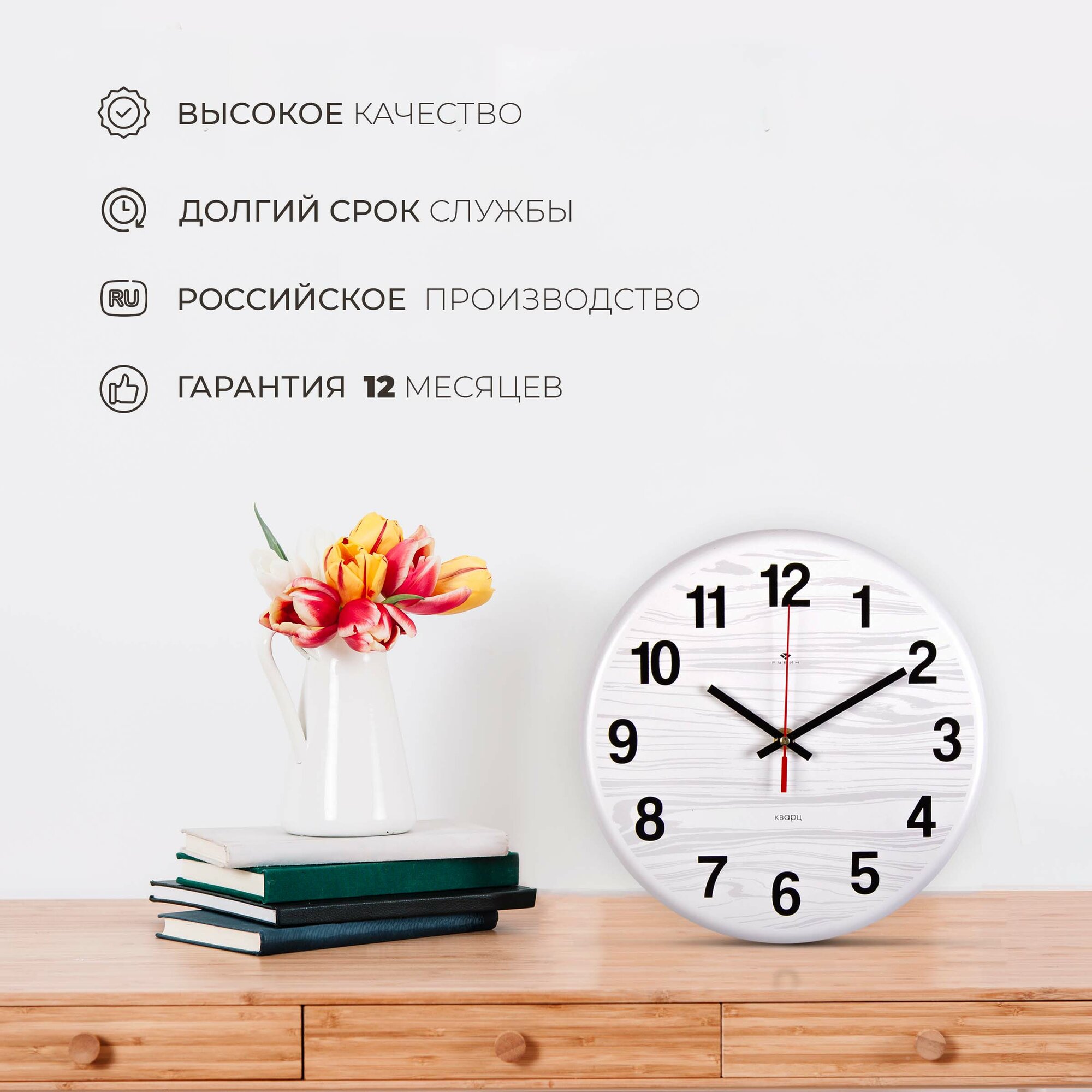 Часы настенные, кварцевые, белые, бесшумные, круглые, пластик, стекло, арабские цифры, Рубин