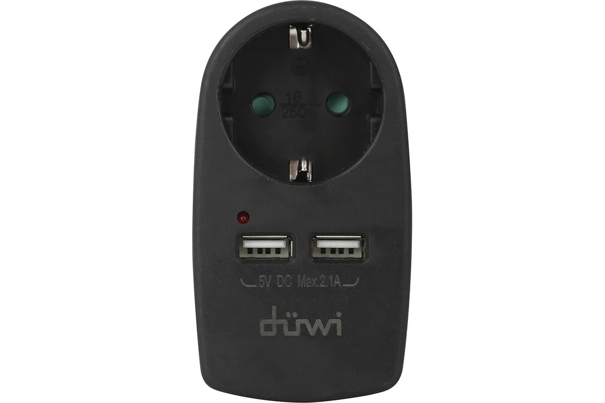 Адаптер розеточный 1 гнездо + 2 USB порта, с заземлением, черный, 16A, 3680Вт duwi 27419 3