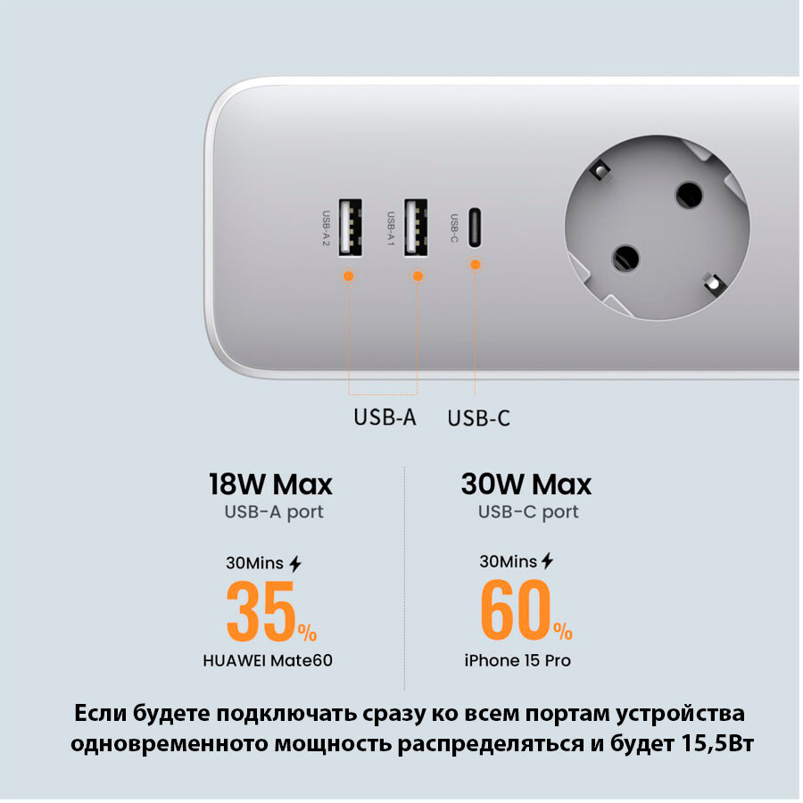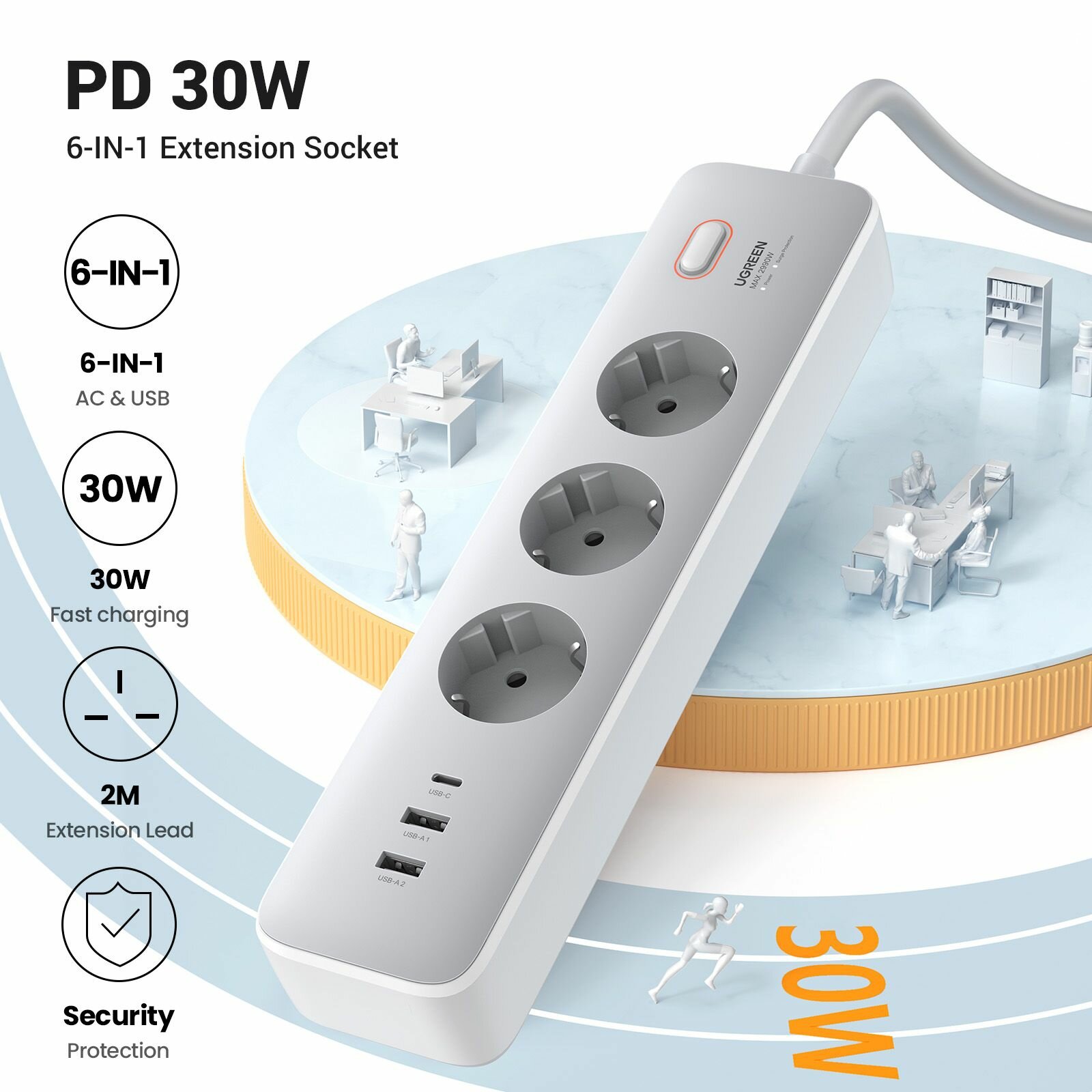 Сетевой фильтр (удлинитель) UGREEN CD286 (25357) с розетками 30W 3AC (2A1C) EU. Цвет: белый интересное: