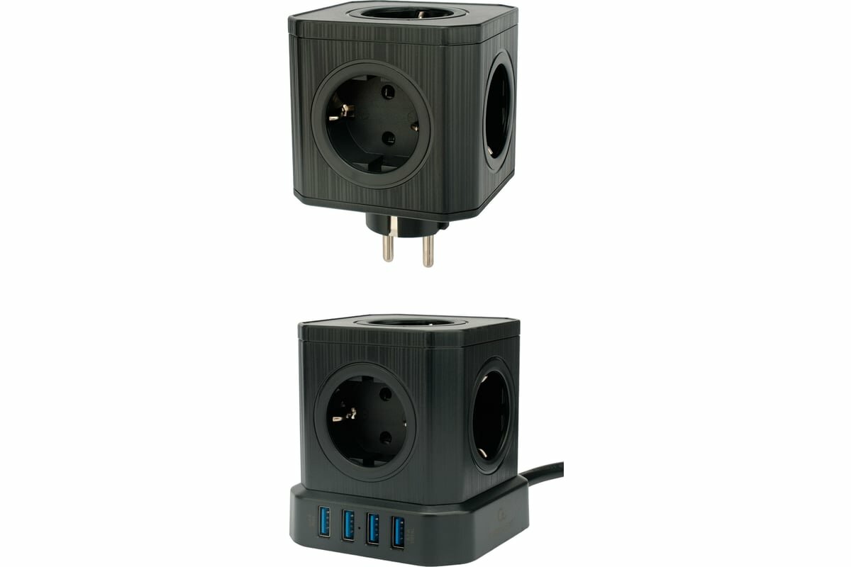 Сетевой фильтр Cablexpert Cube, 3 розетки, 1xType-C, 3xUSB, 1.5м, черный, коробка