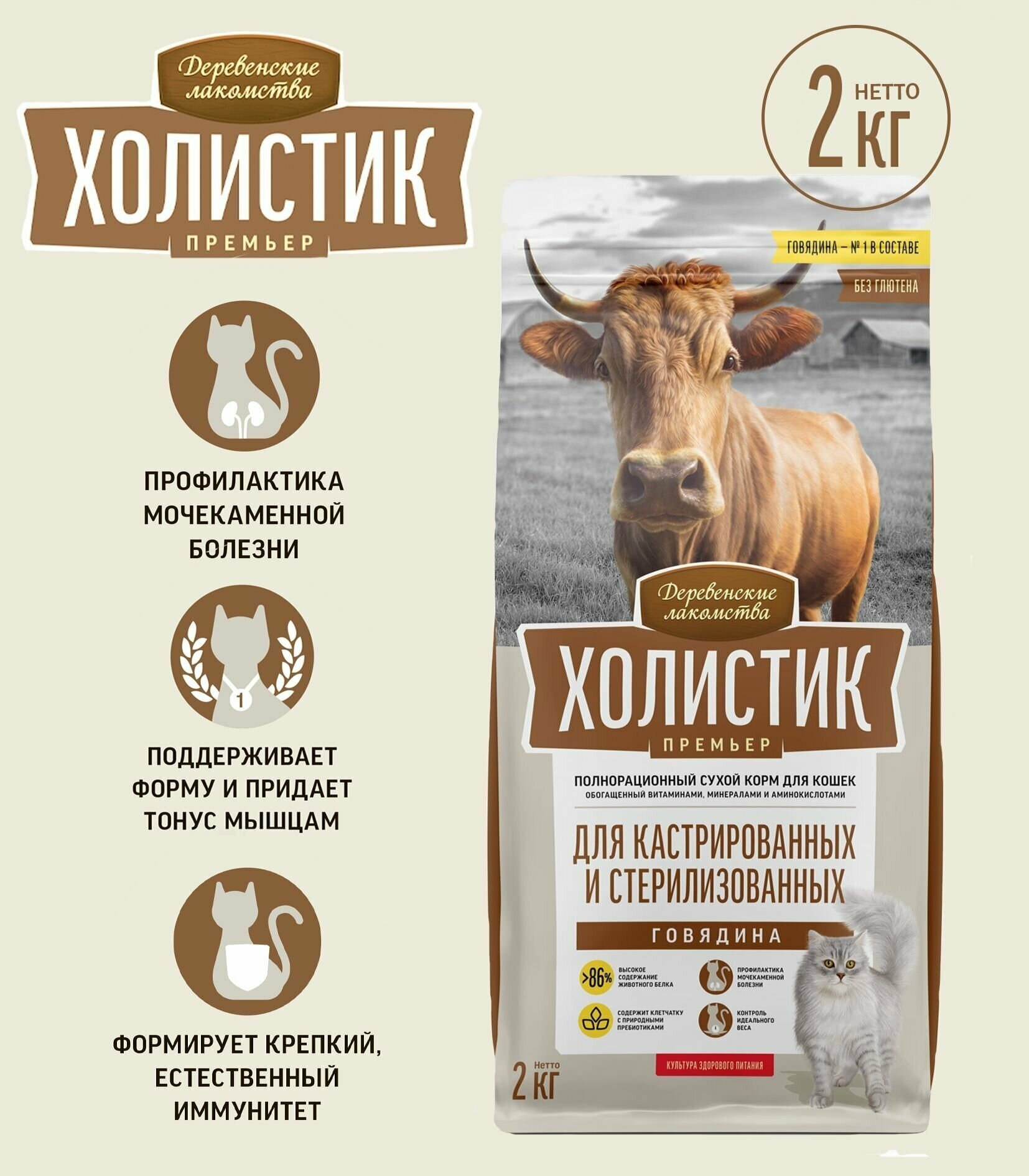 Корм сухой Деревенские Лакомства холистик премьер полнорационный, для стерилизованных кошек с говядиной, 2 кг