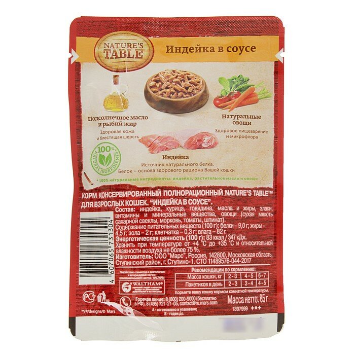 NATURE'S TABLE для взрослых кошек с индейкой в соусе пауч 85 гр 85 гр х 4 шт