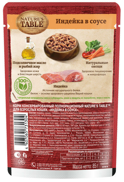 NATURE'S TABLE для взрослых кошек с индейкой в соусе пауч 85 гр 85 гр х 4 шт