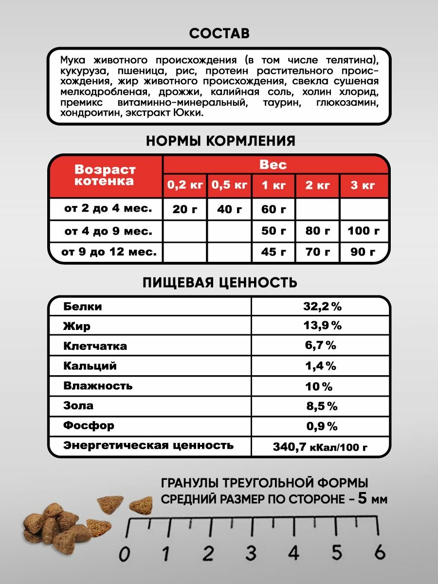 | Дозировка | от 20 до 100 г суточная норма от возраста котенка |