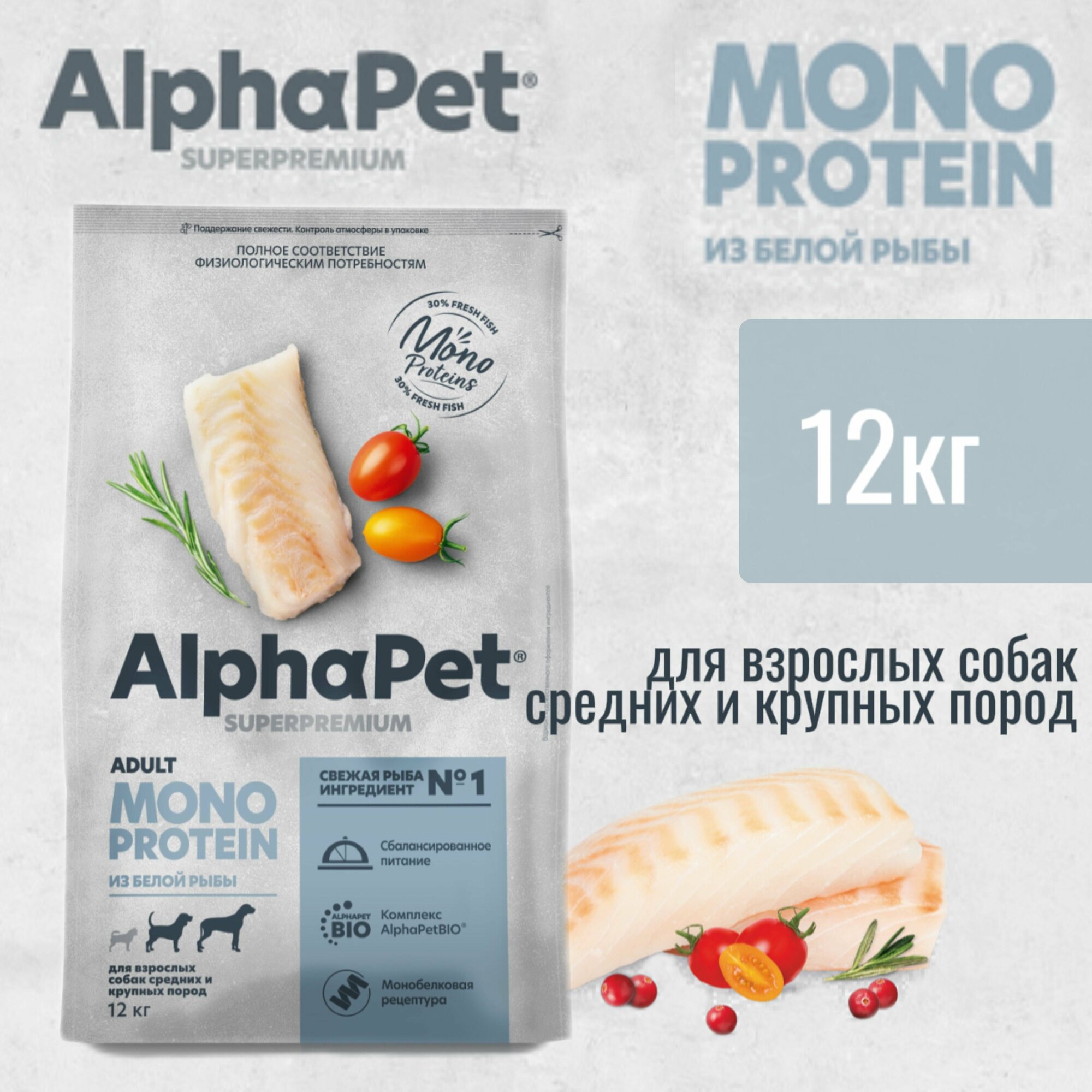 Cухой корм AlphaPet Superpremium Monoprotein (Альфапет) для взрослых собак средних и крупных пород, с белой рыбой, 12 кг