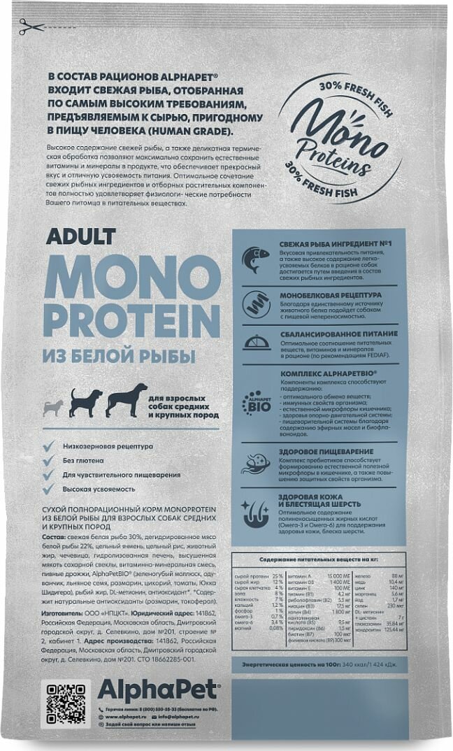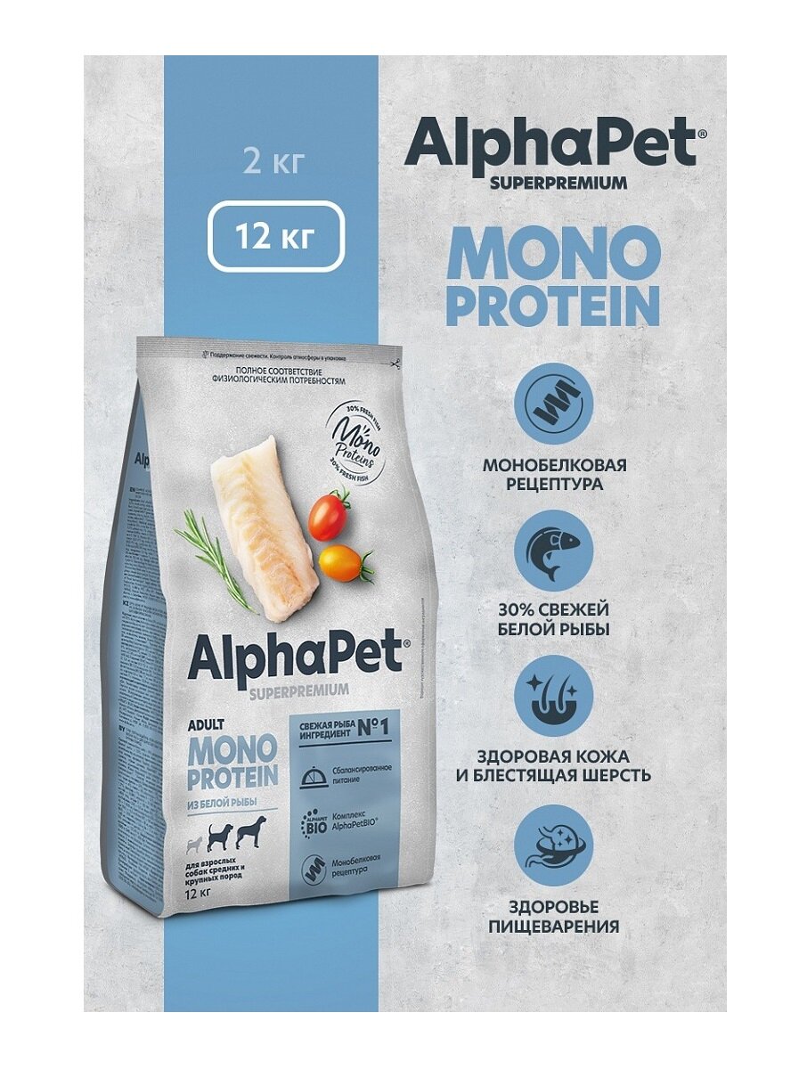 AlphaPet MONOPROTEIN сухой корм для взрослых собак средних и крупных пород из Белой рыбы, 12кг